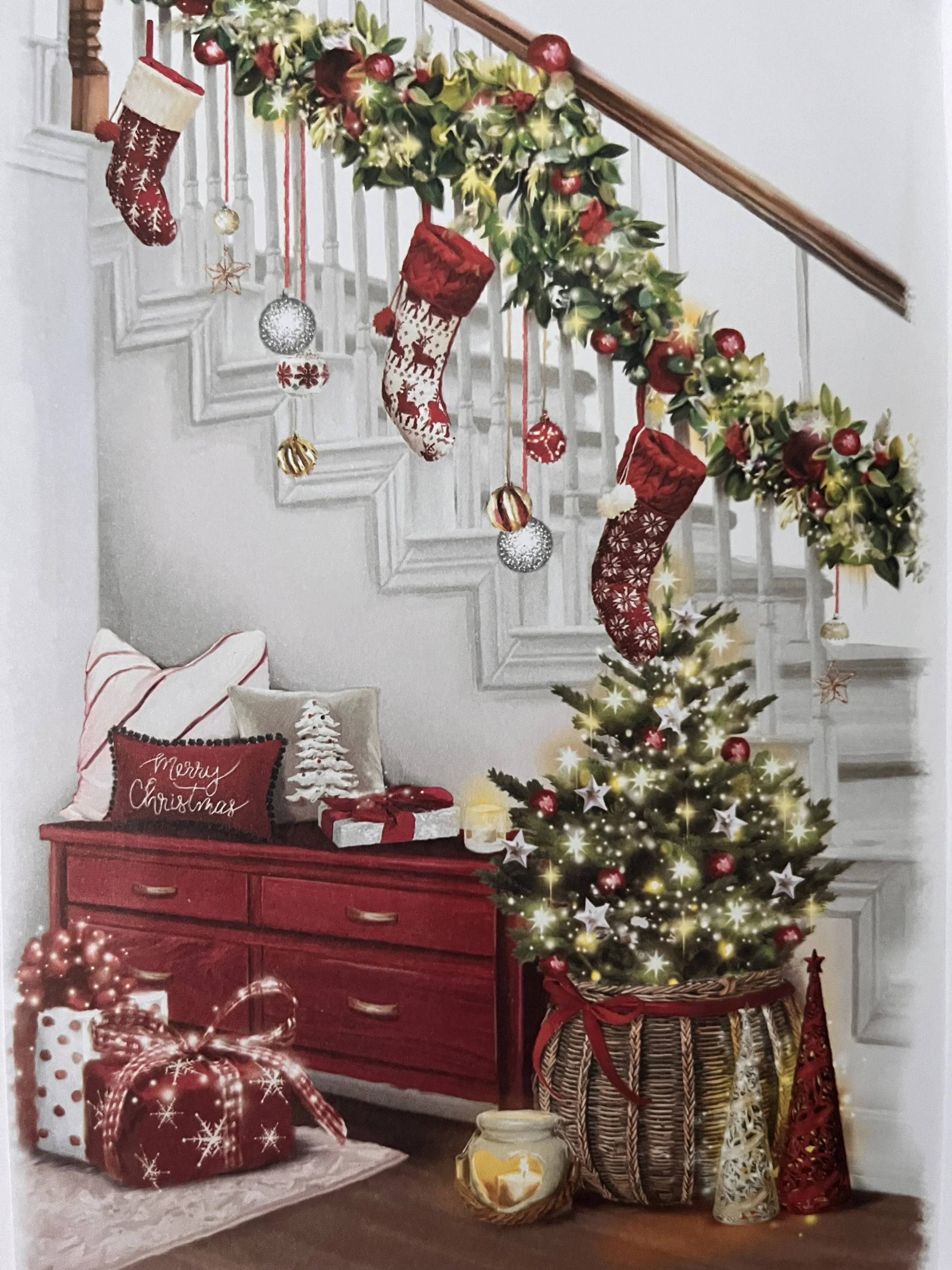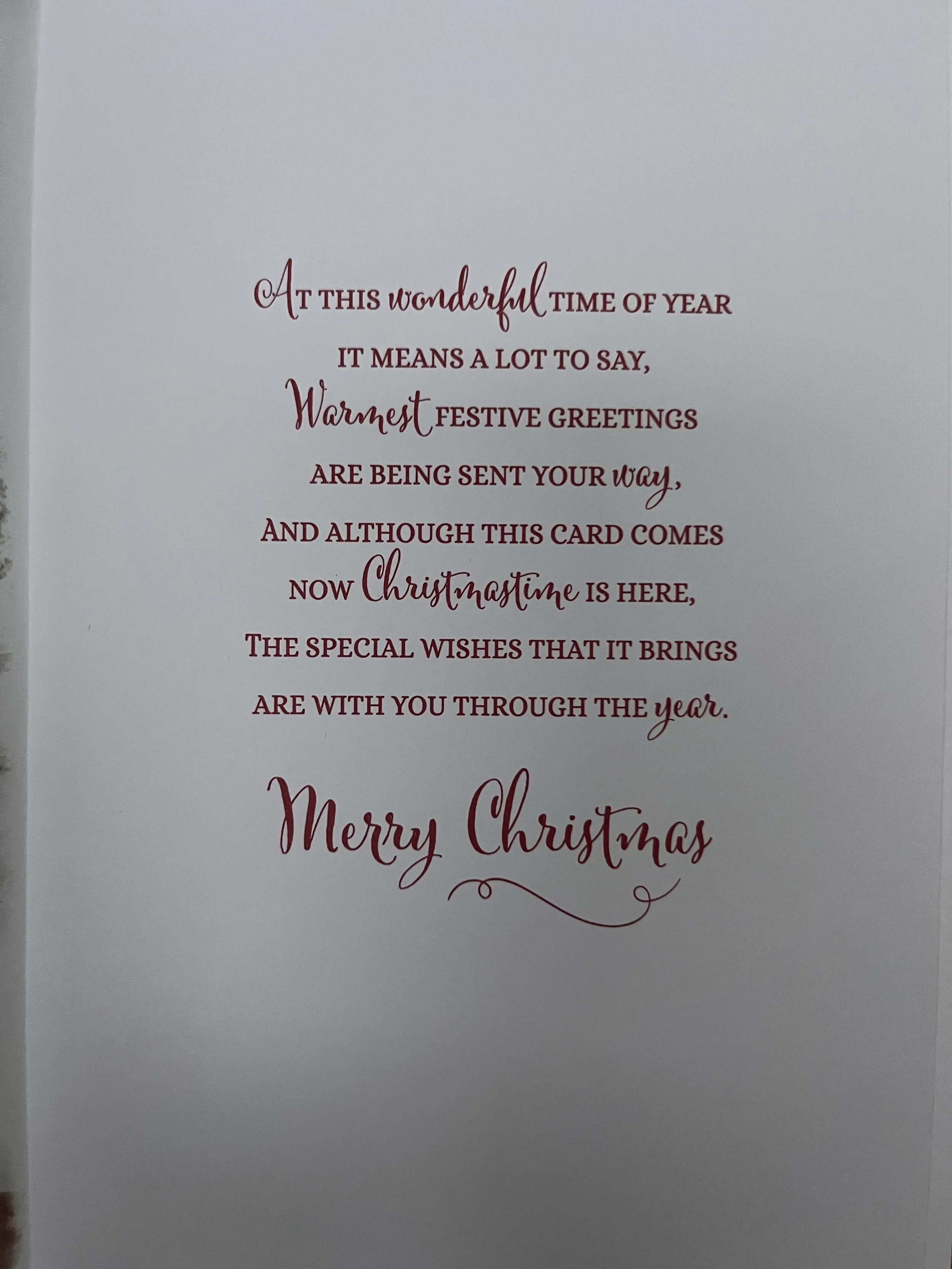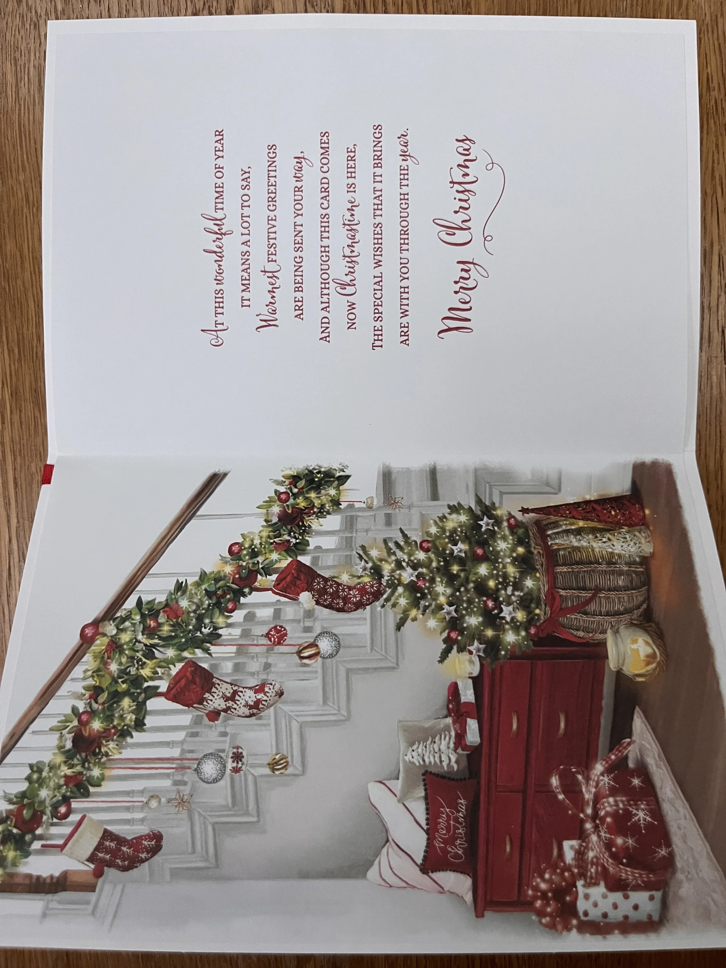 Neighbours Christmas card design features a red and white twisted paper ribbon and bow, effective foil and inside a festive full colour illustrated insert