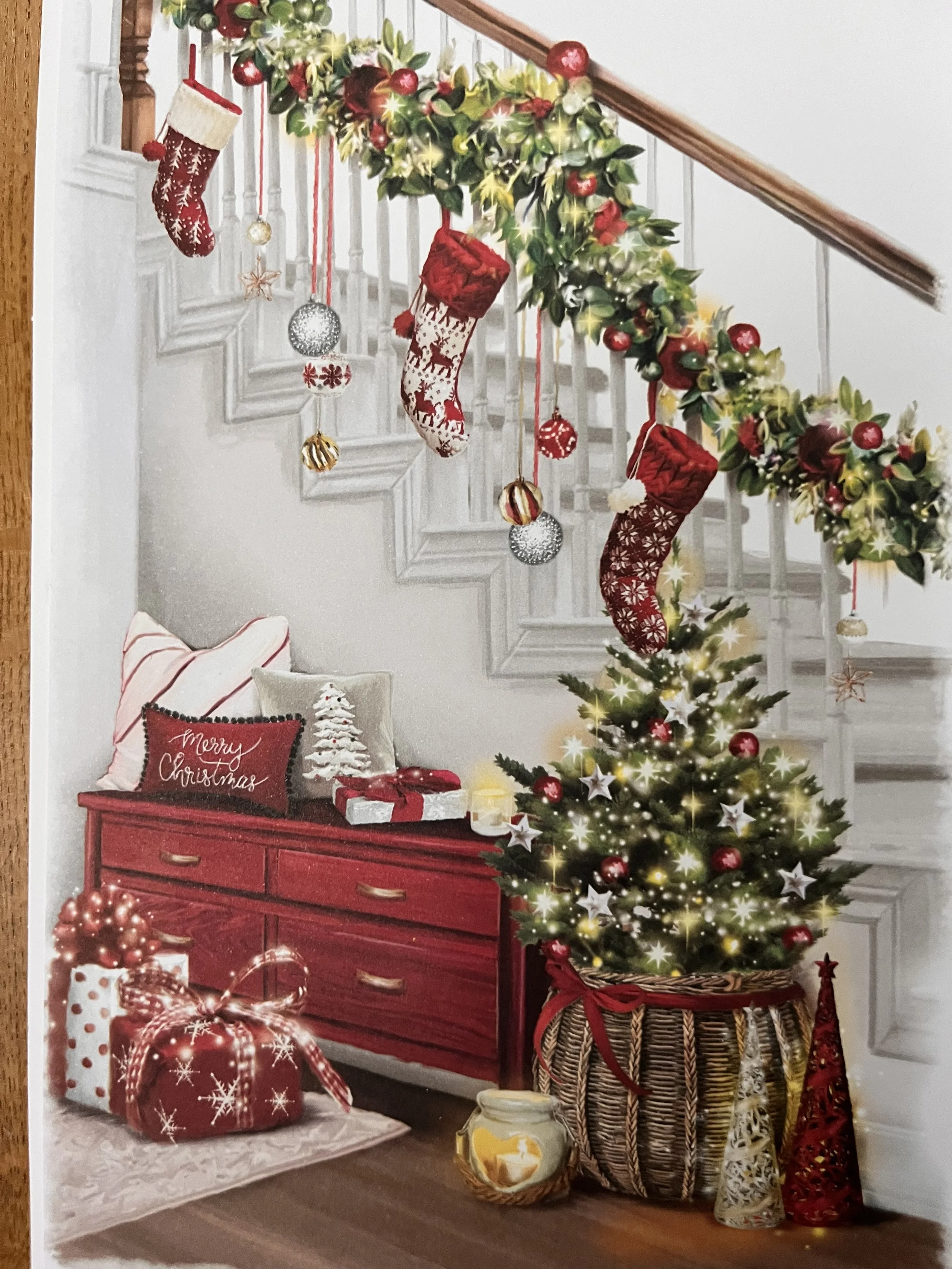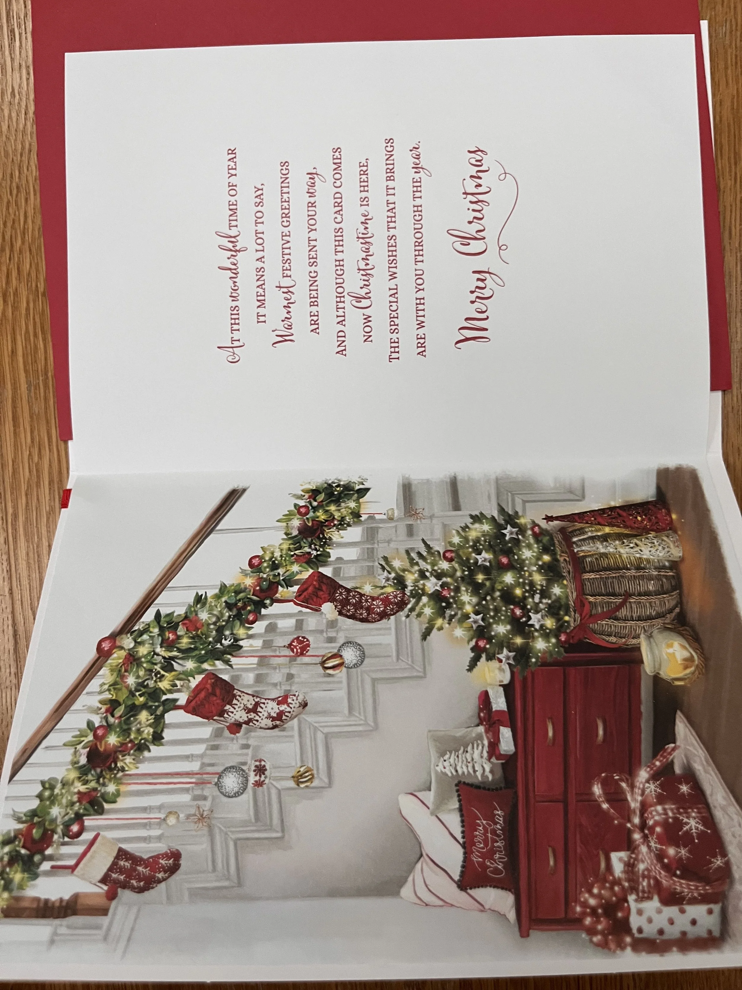 Christmas card design features a shaped embossed and foiled 3D attachment, effective foil, embossing and a colour illustrated insert inside