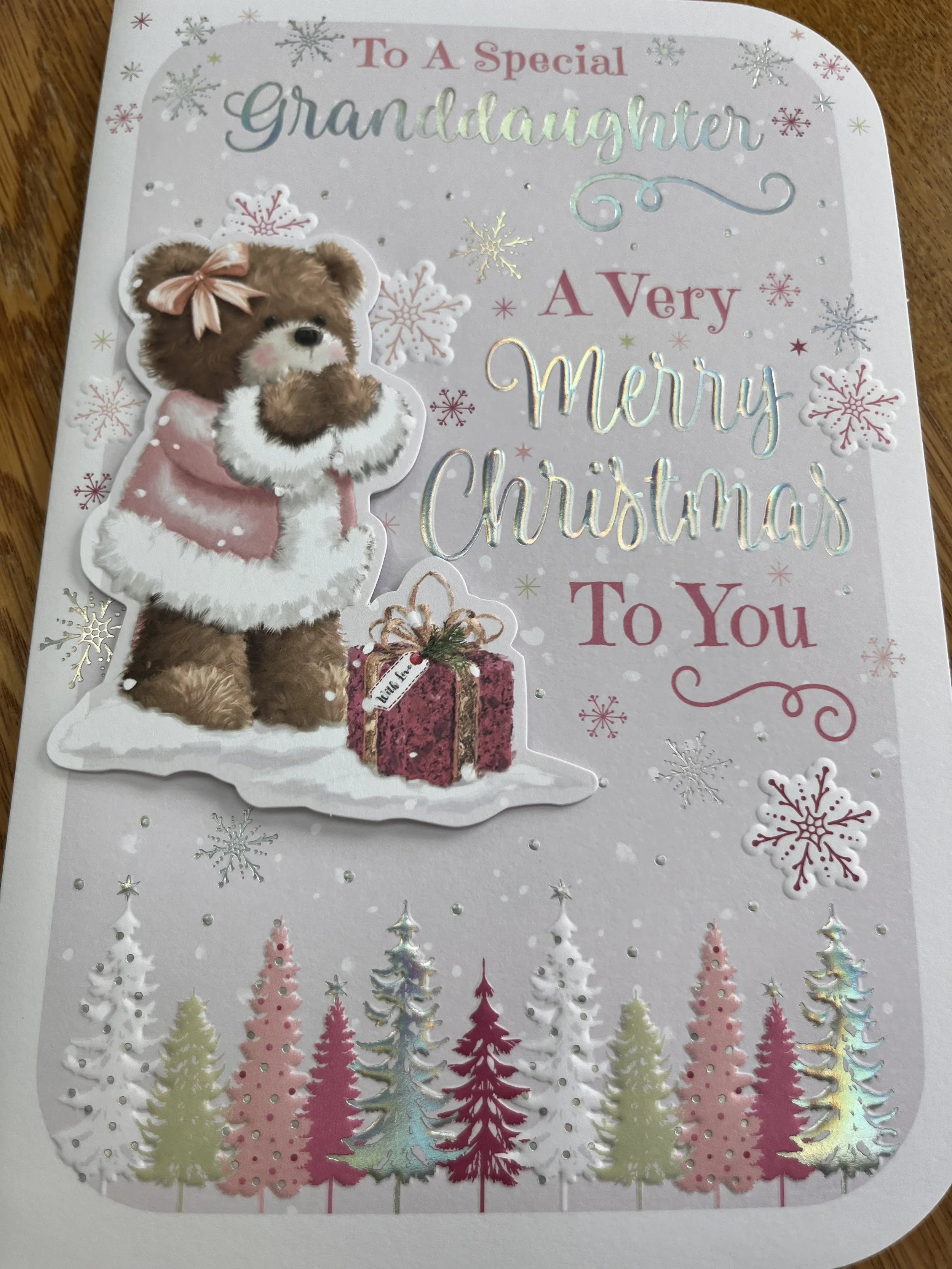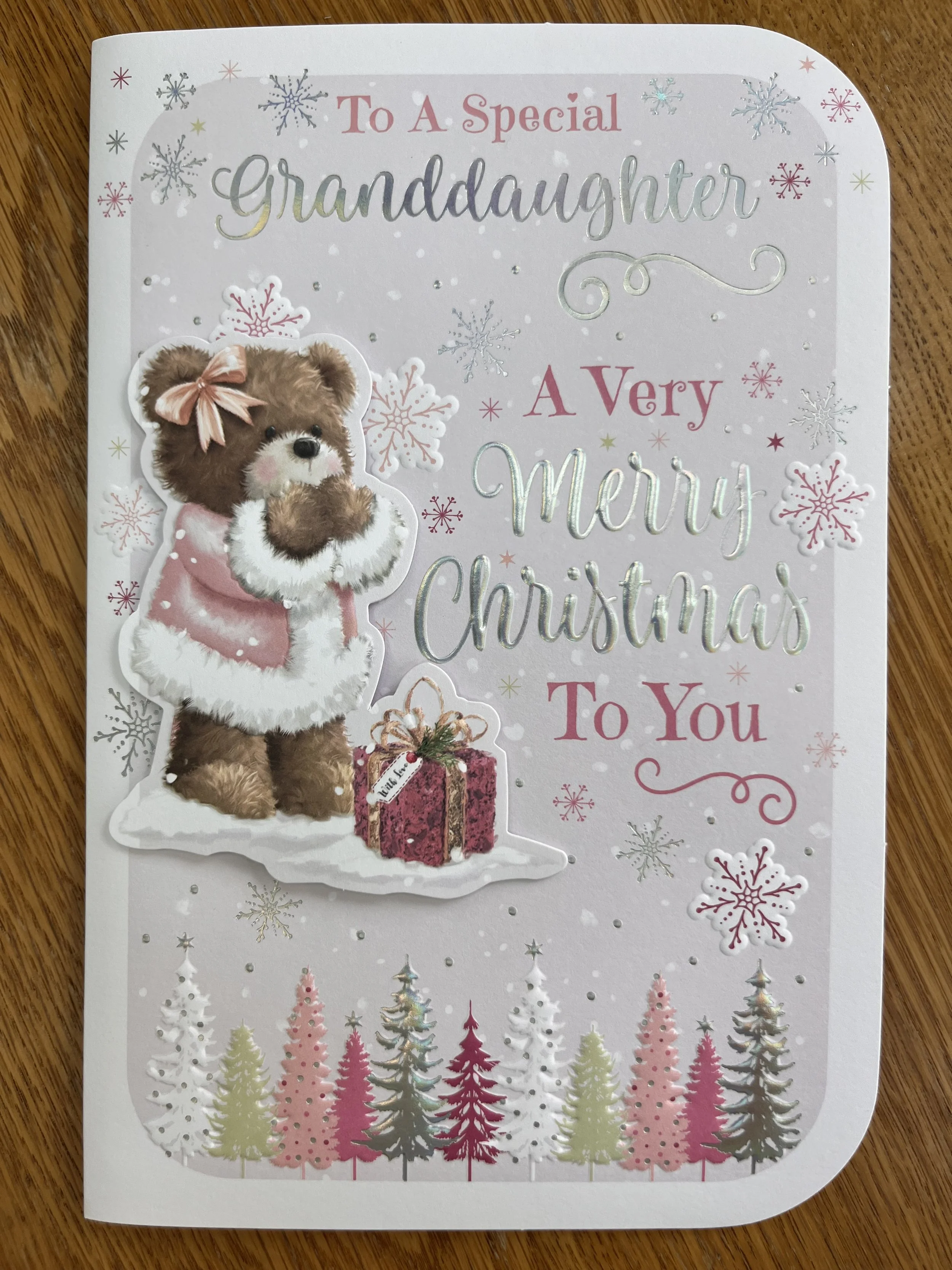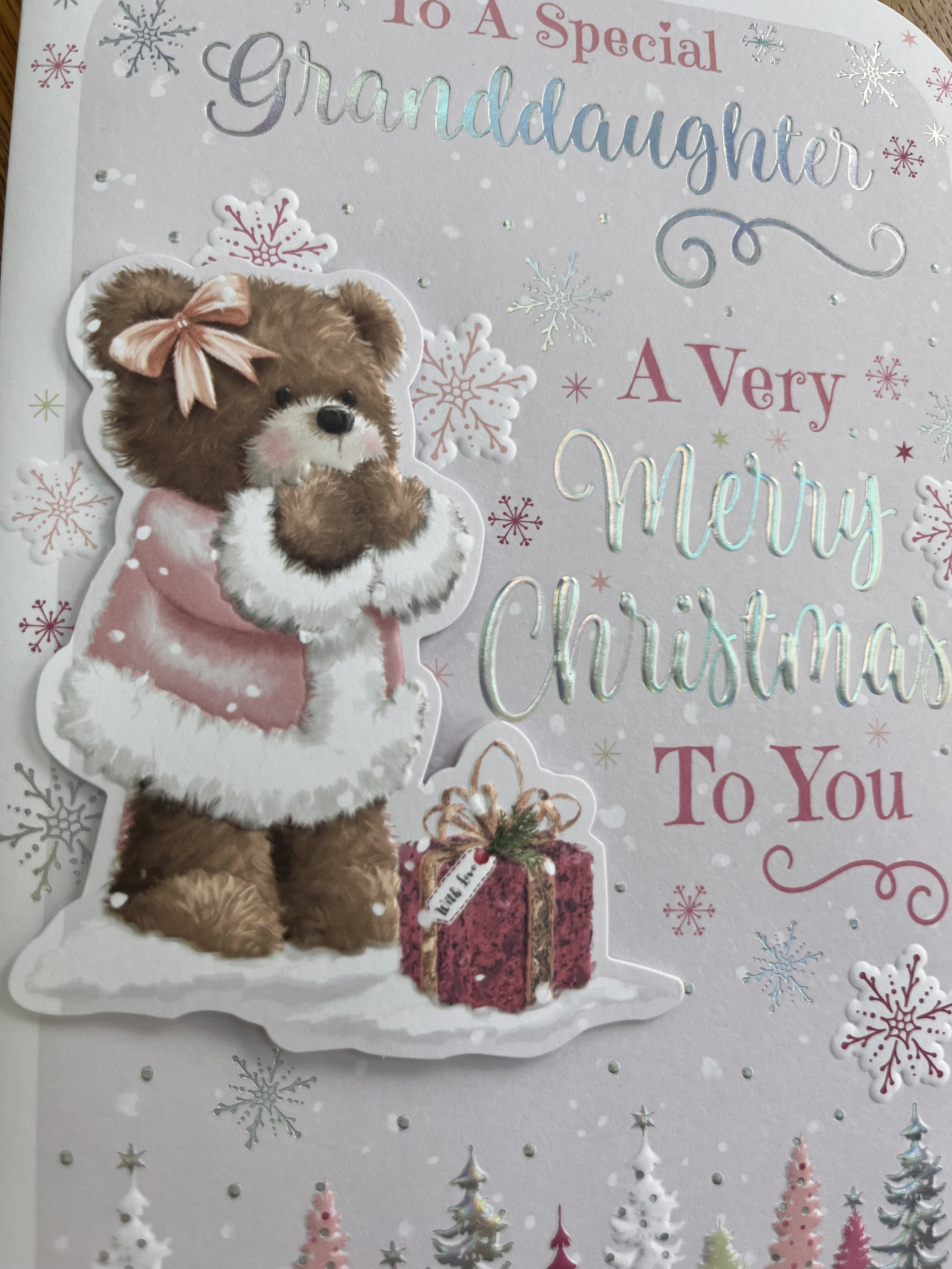 Granddaughter Christmas Card design Is a sweet bear design with heartfelt words that continue inside on a full colour illustrated insert