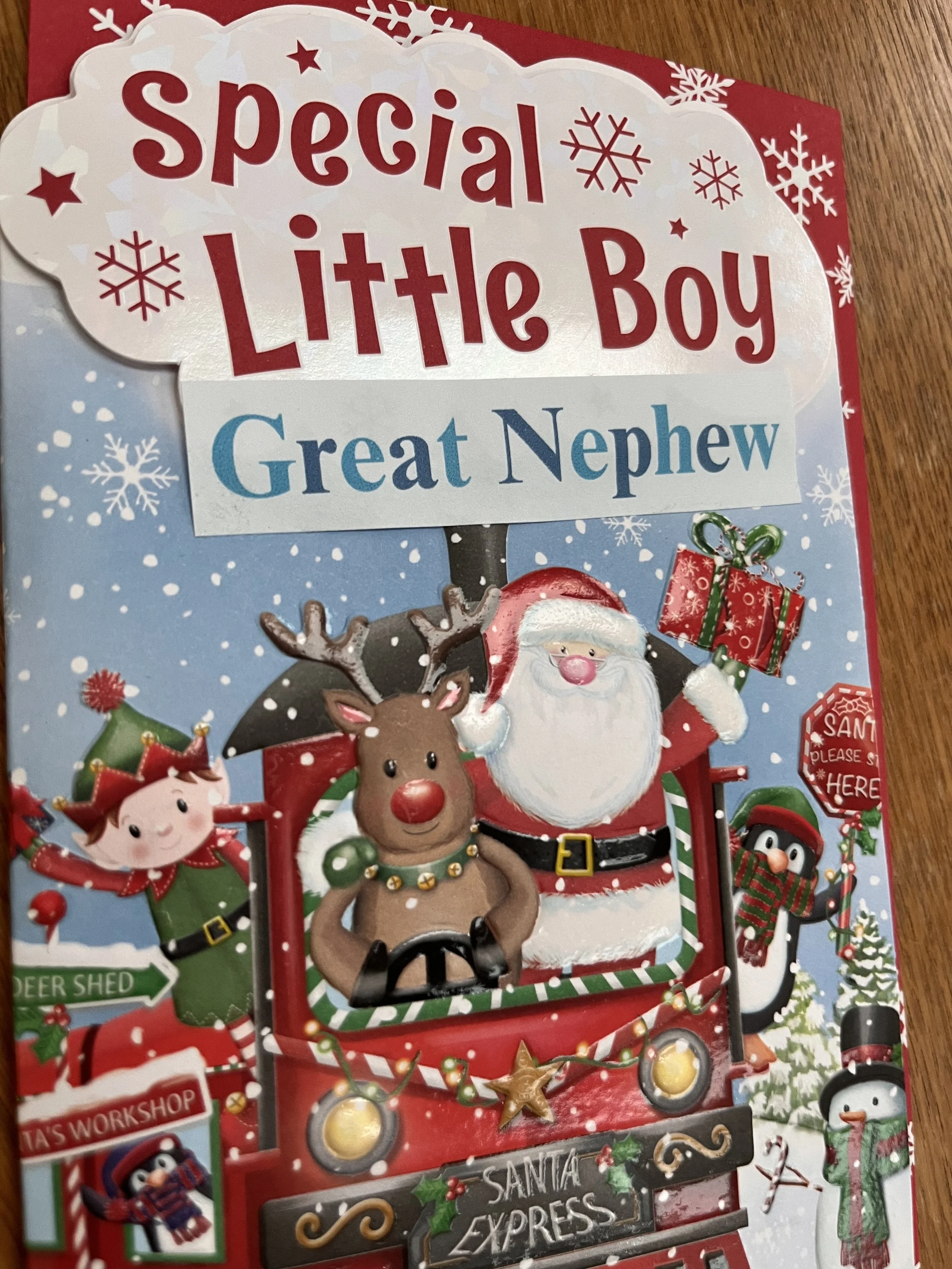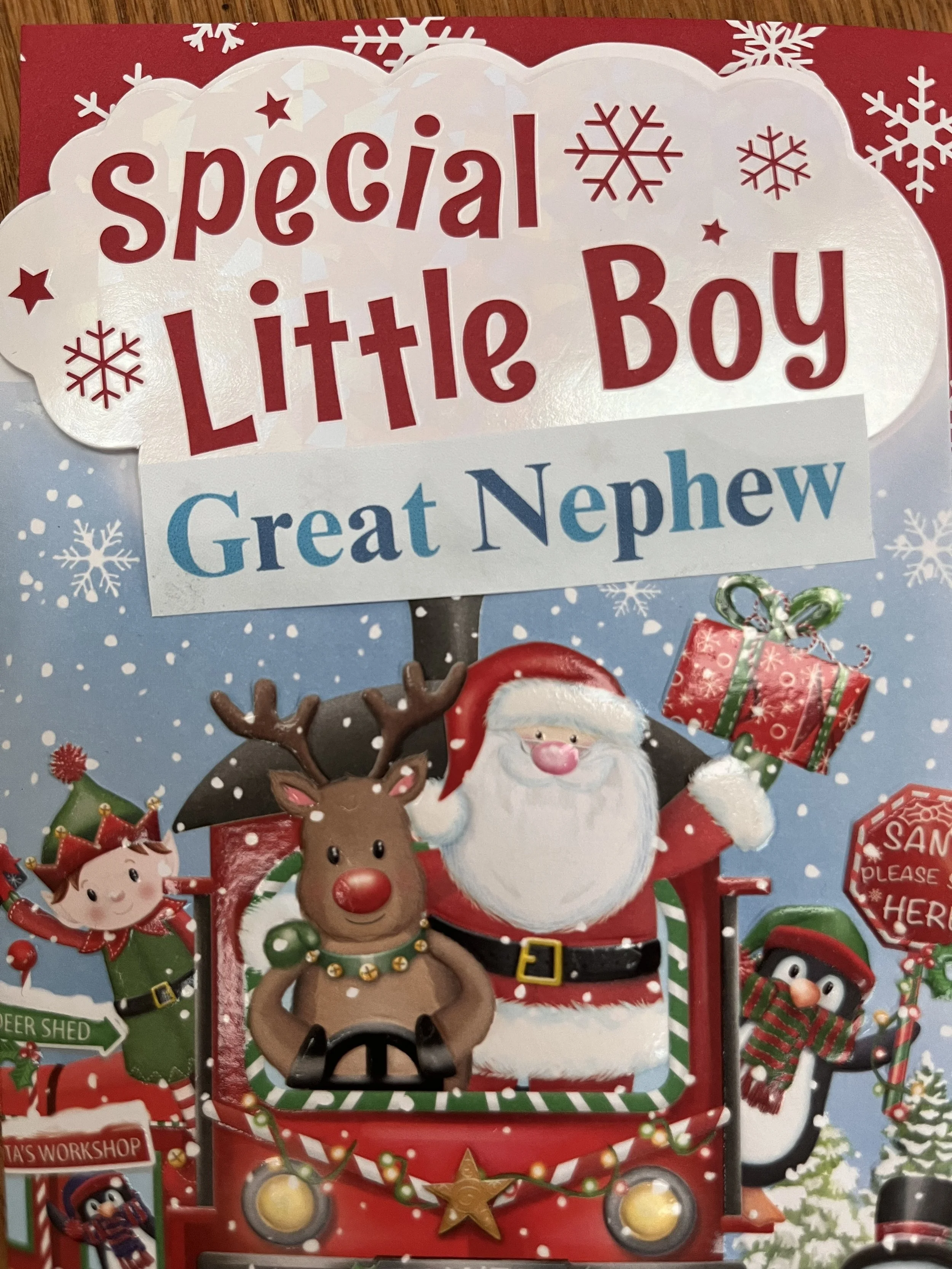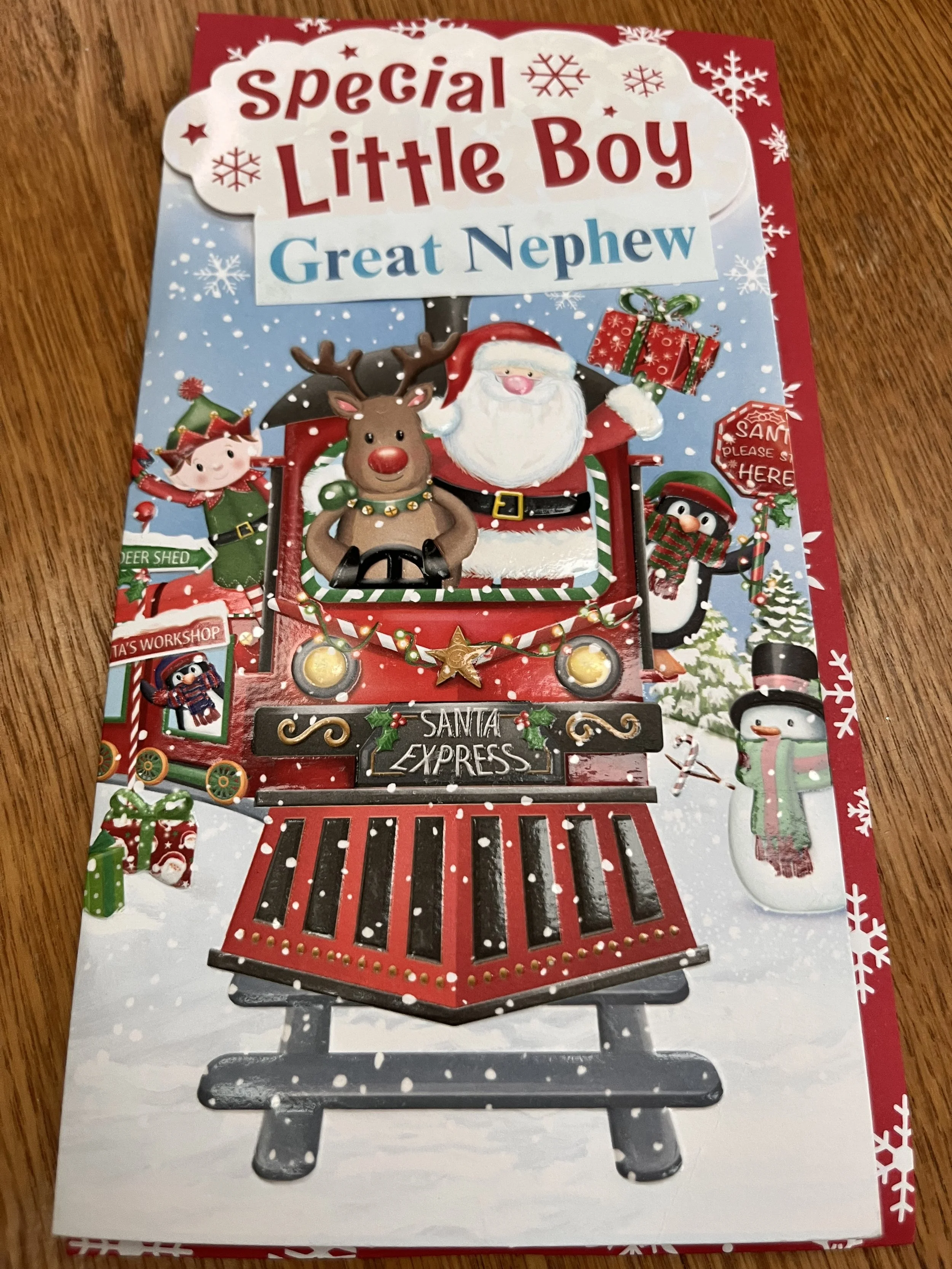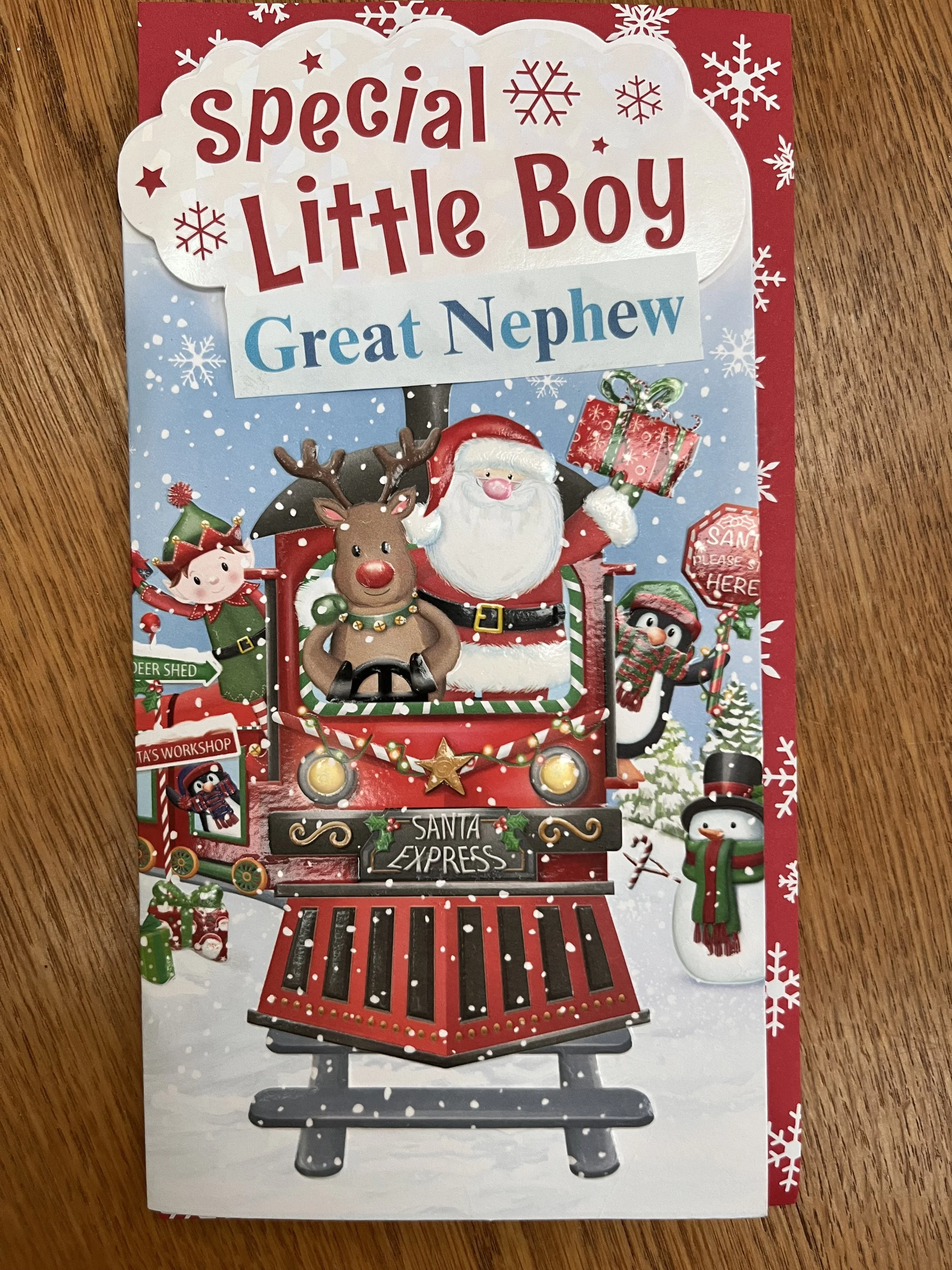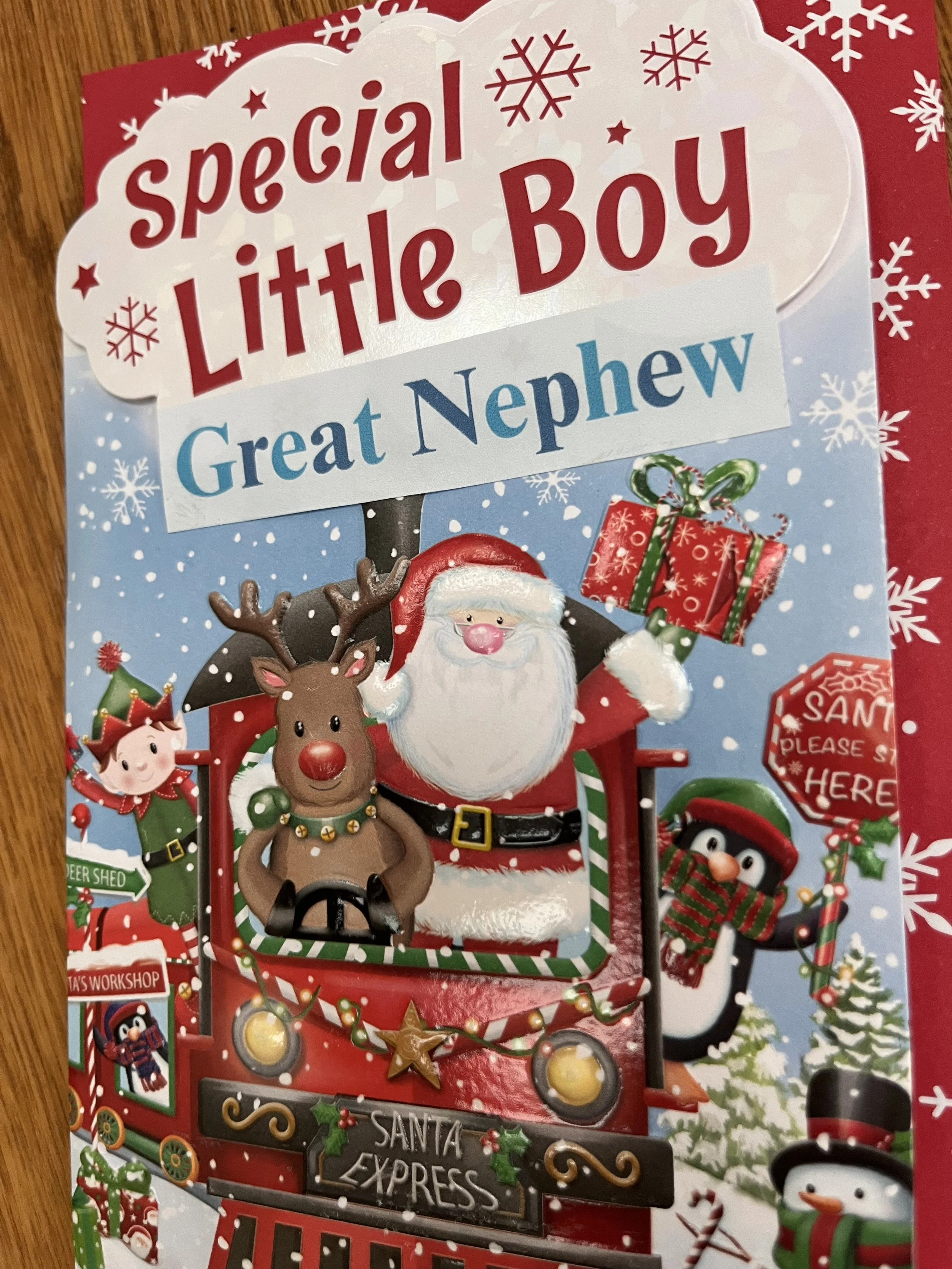 Great Nephew Christmas Card design features effective red foiling, embossing hand finished with an attachment and inside full colour illustrations
