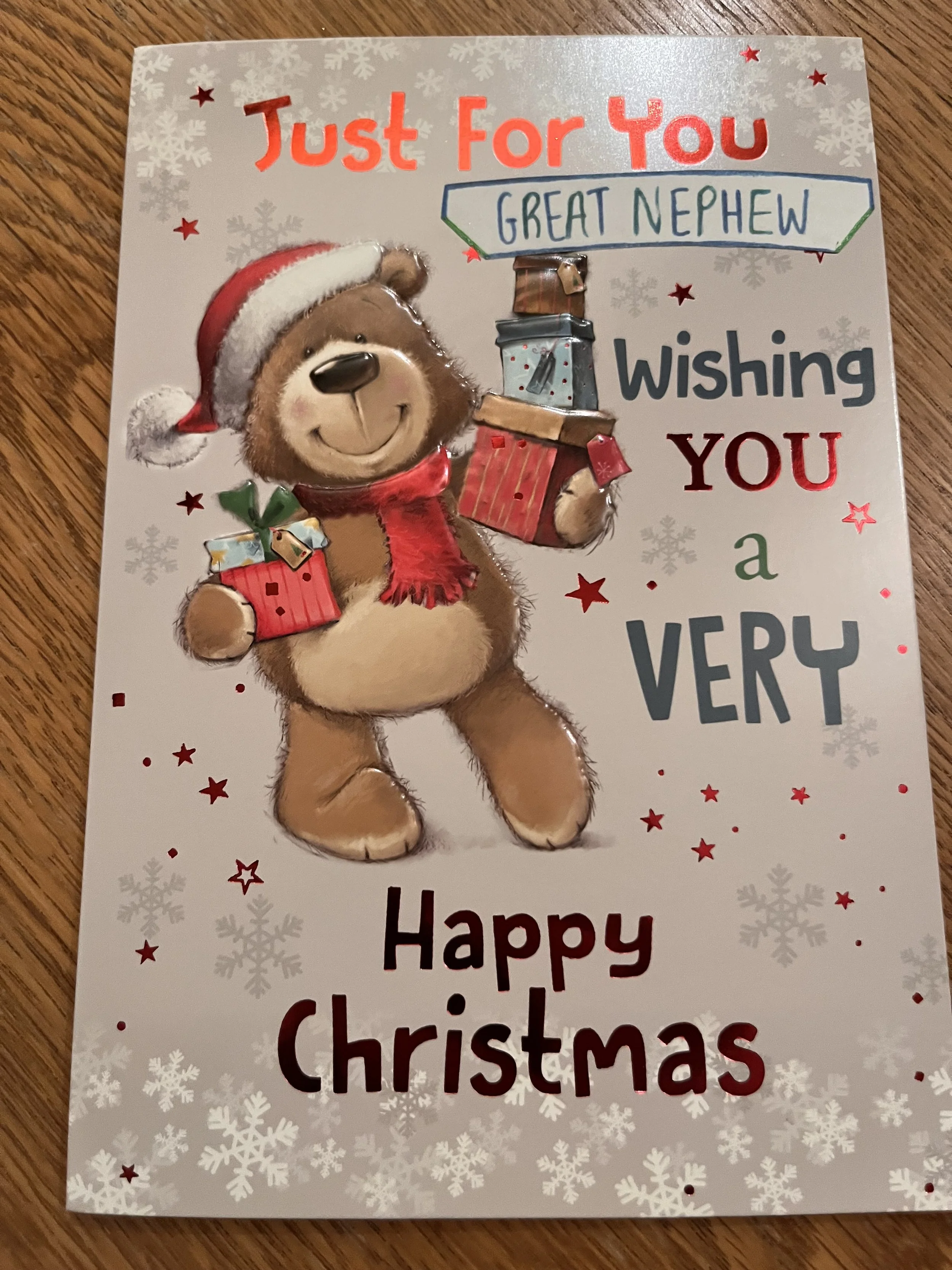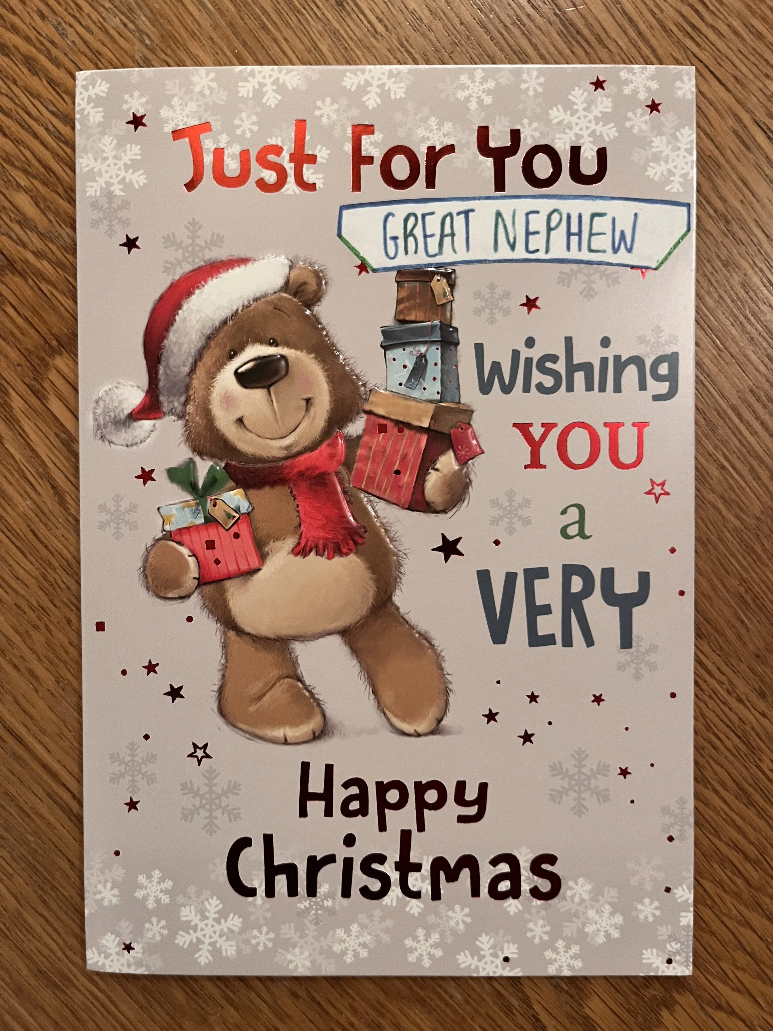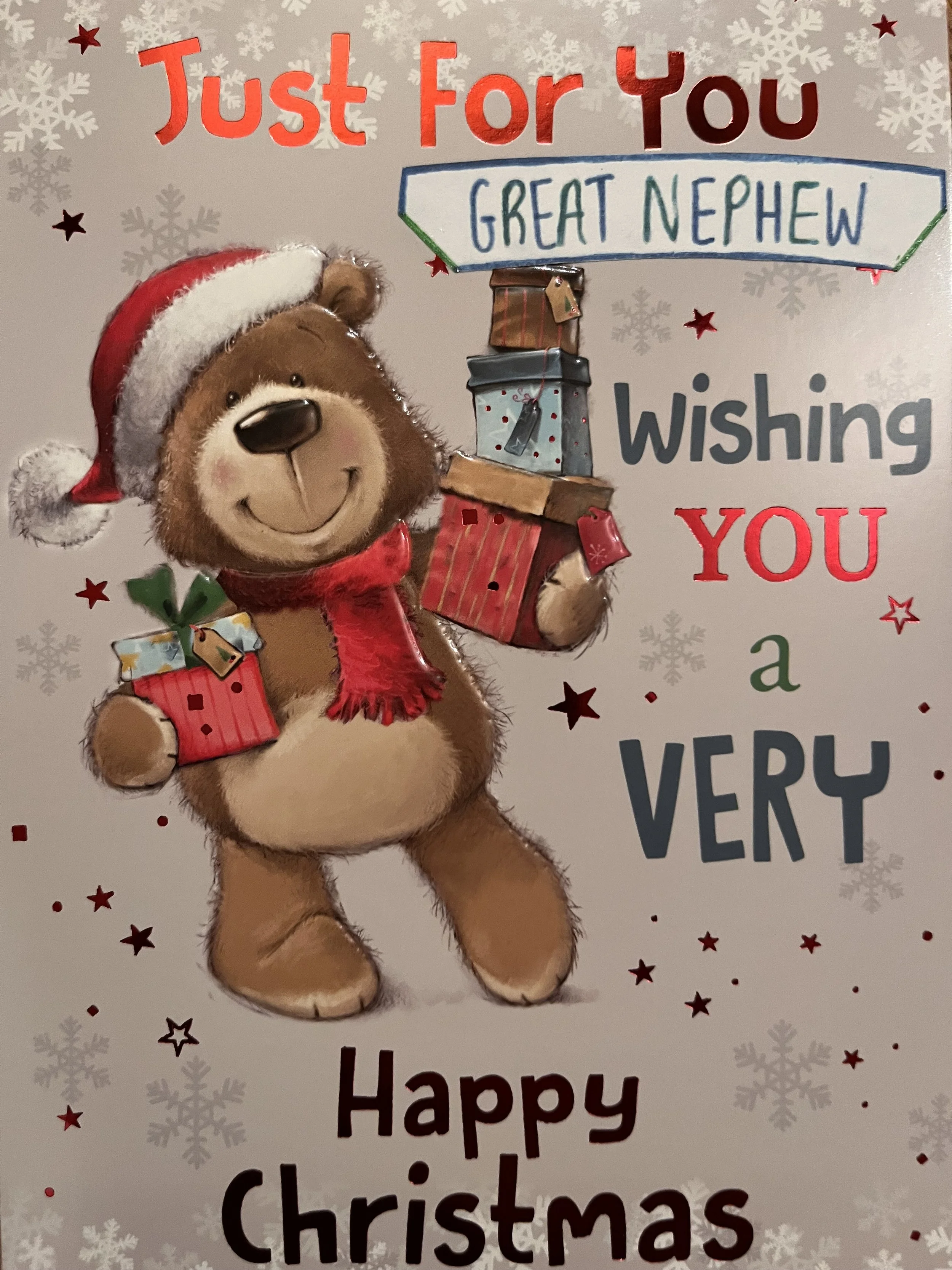 Great Nephew Christmas Card design features effective gold foiling, HAND FINISHED with a blue attachment, fabulous words which continue inside on a full colour illustrated insert - fab Santa story like card