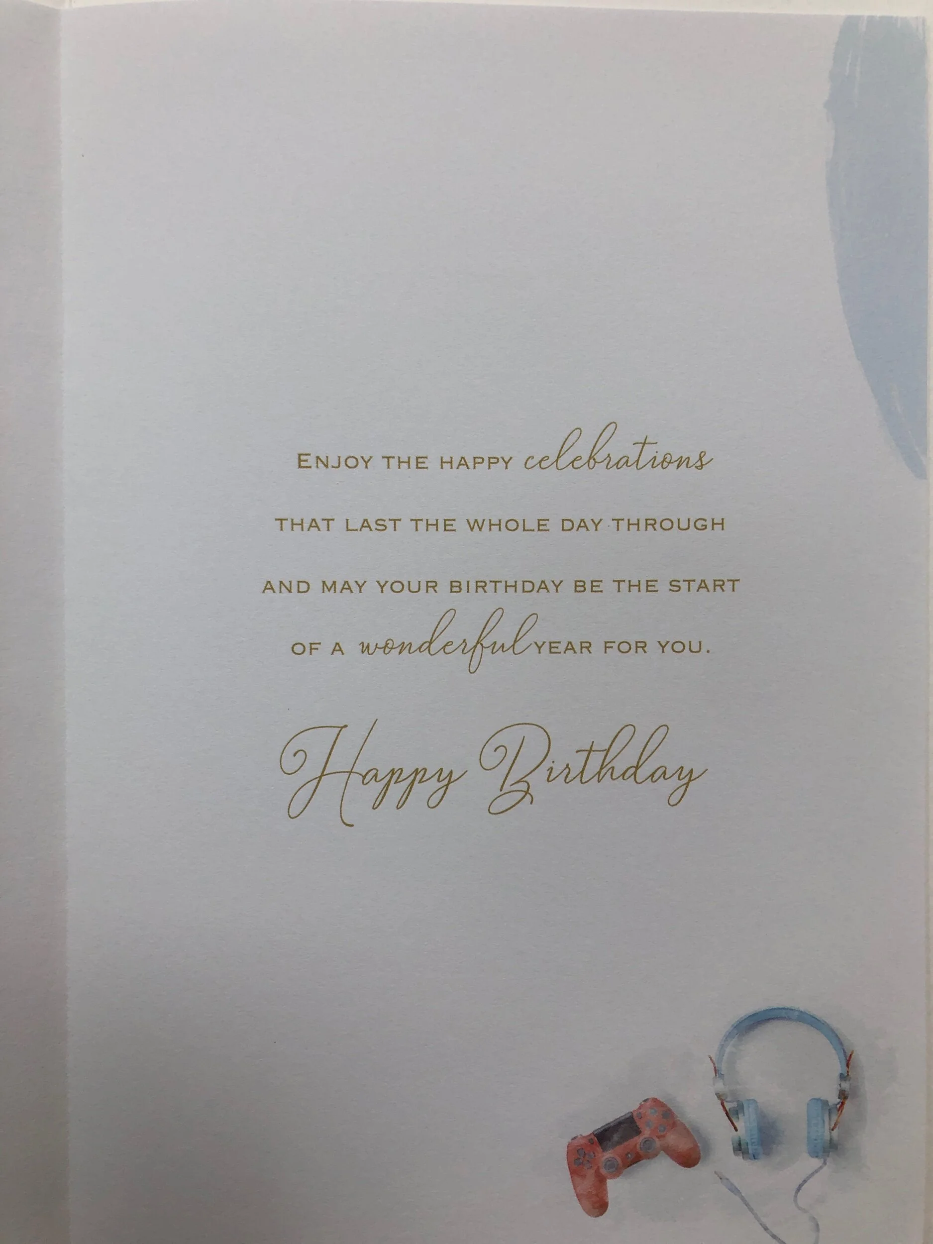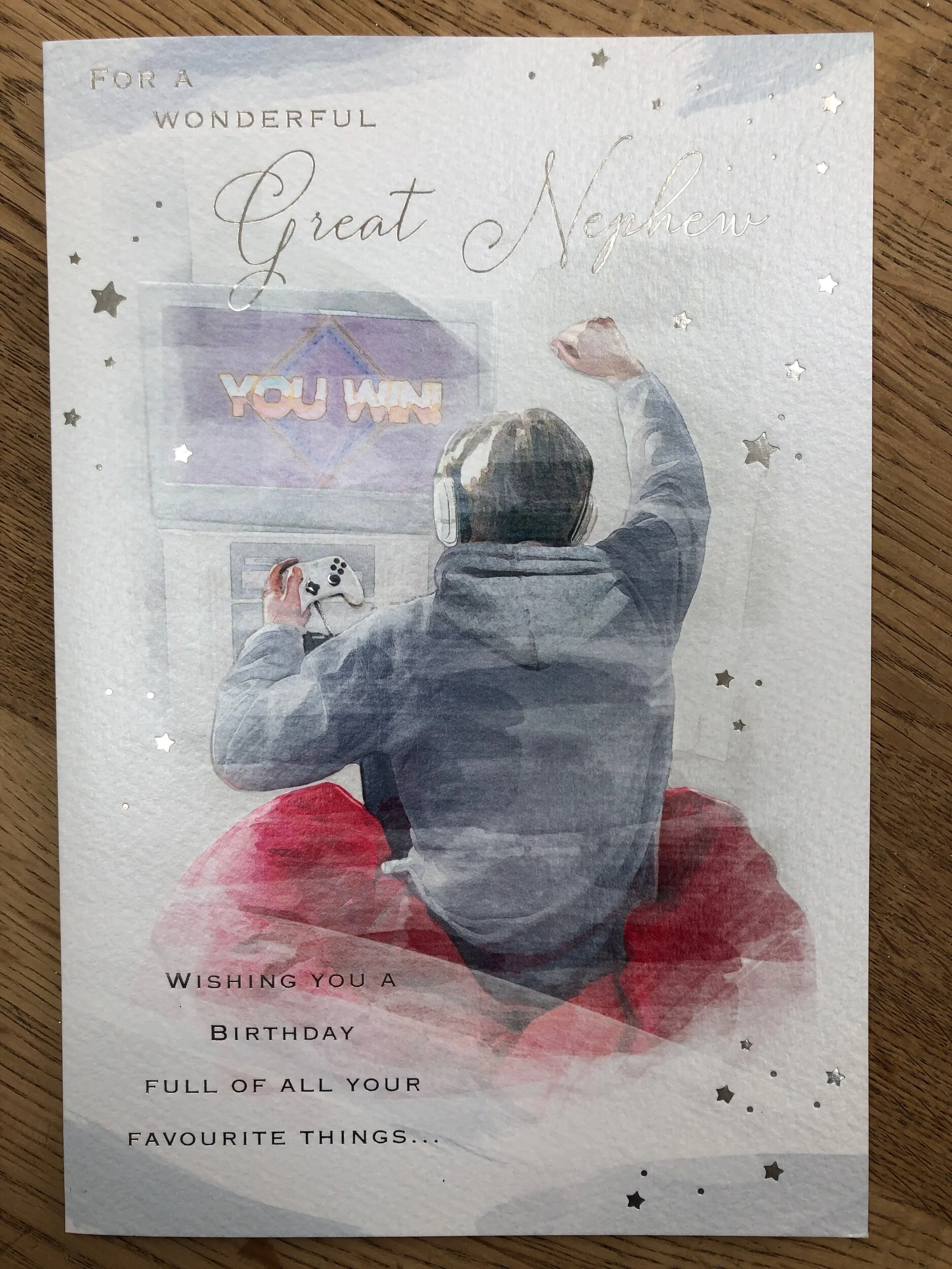 Great Nephew Birthday card product features foil, embossing and a colour illustrated insert inside