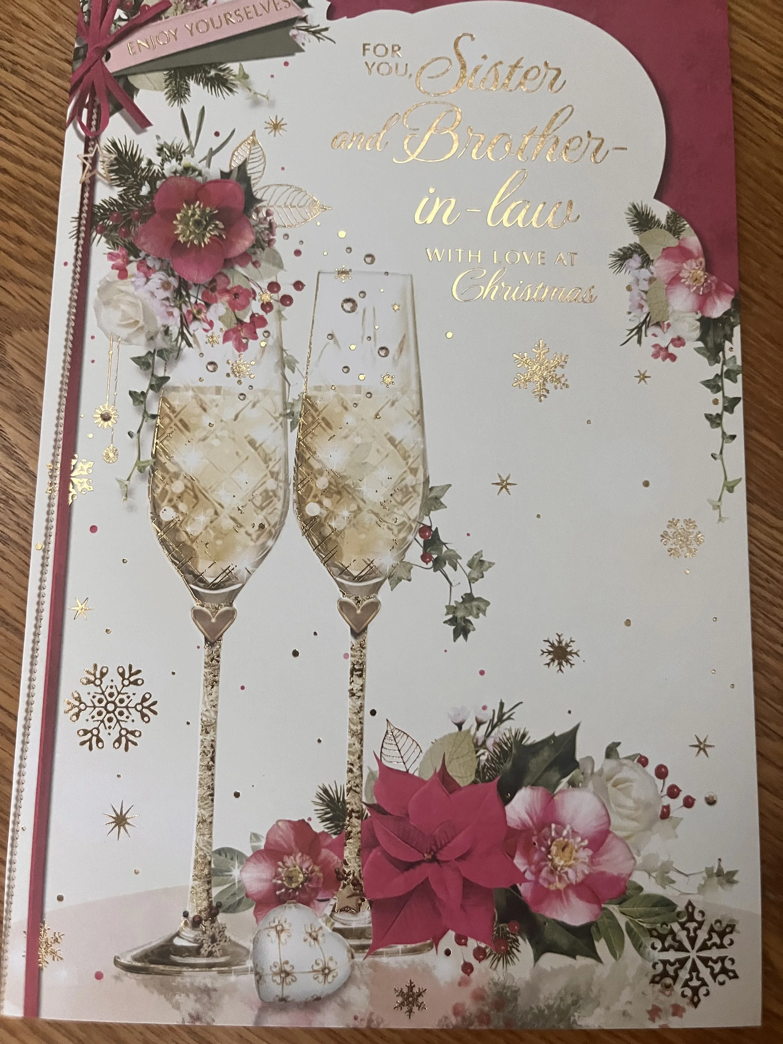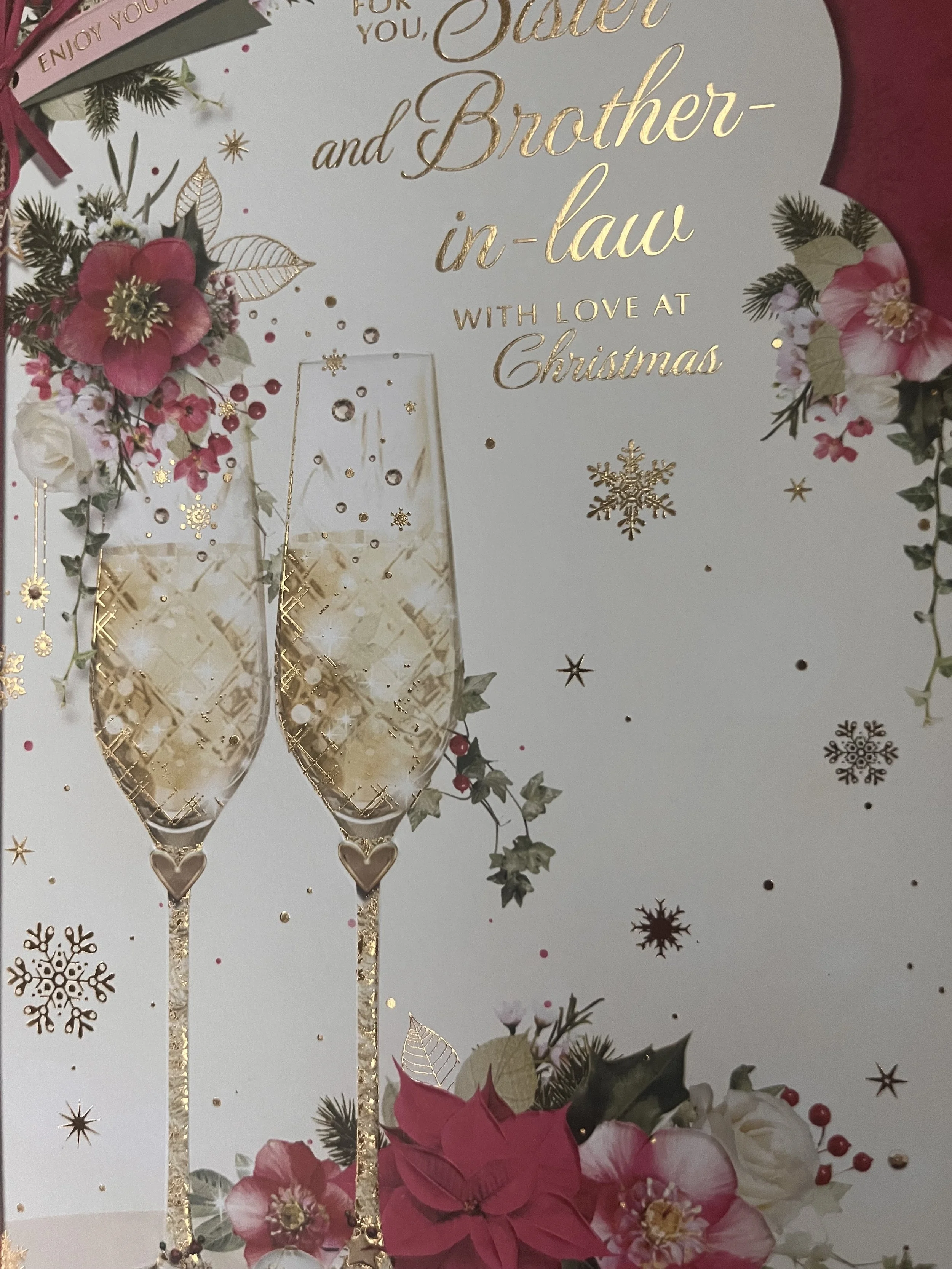 Sister and Brother in Law christmas card design features effective gold foiling on a fabulous design that continues inside on full colour with verse
