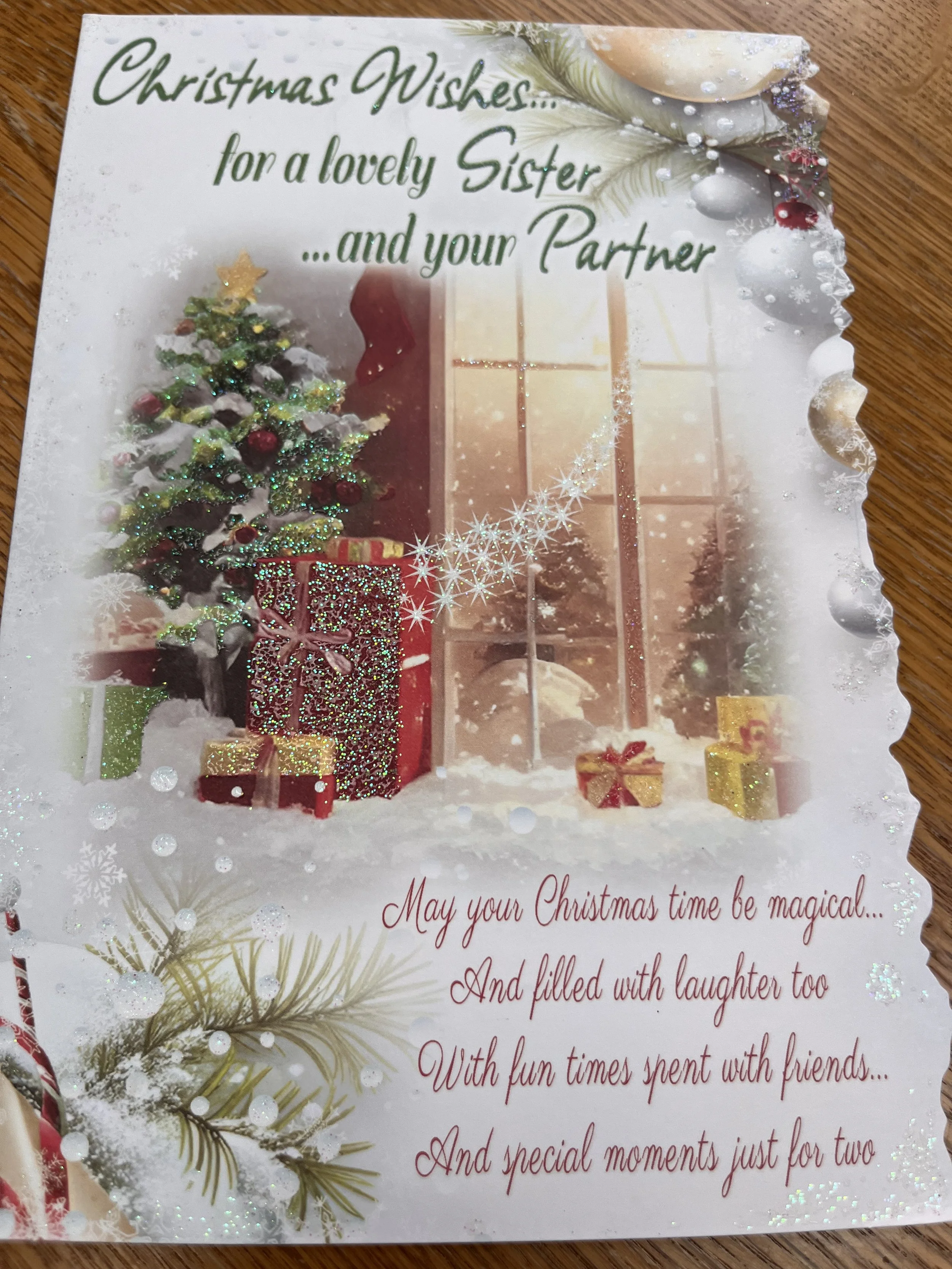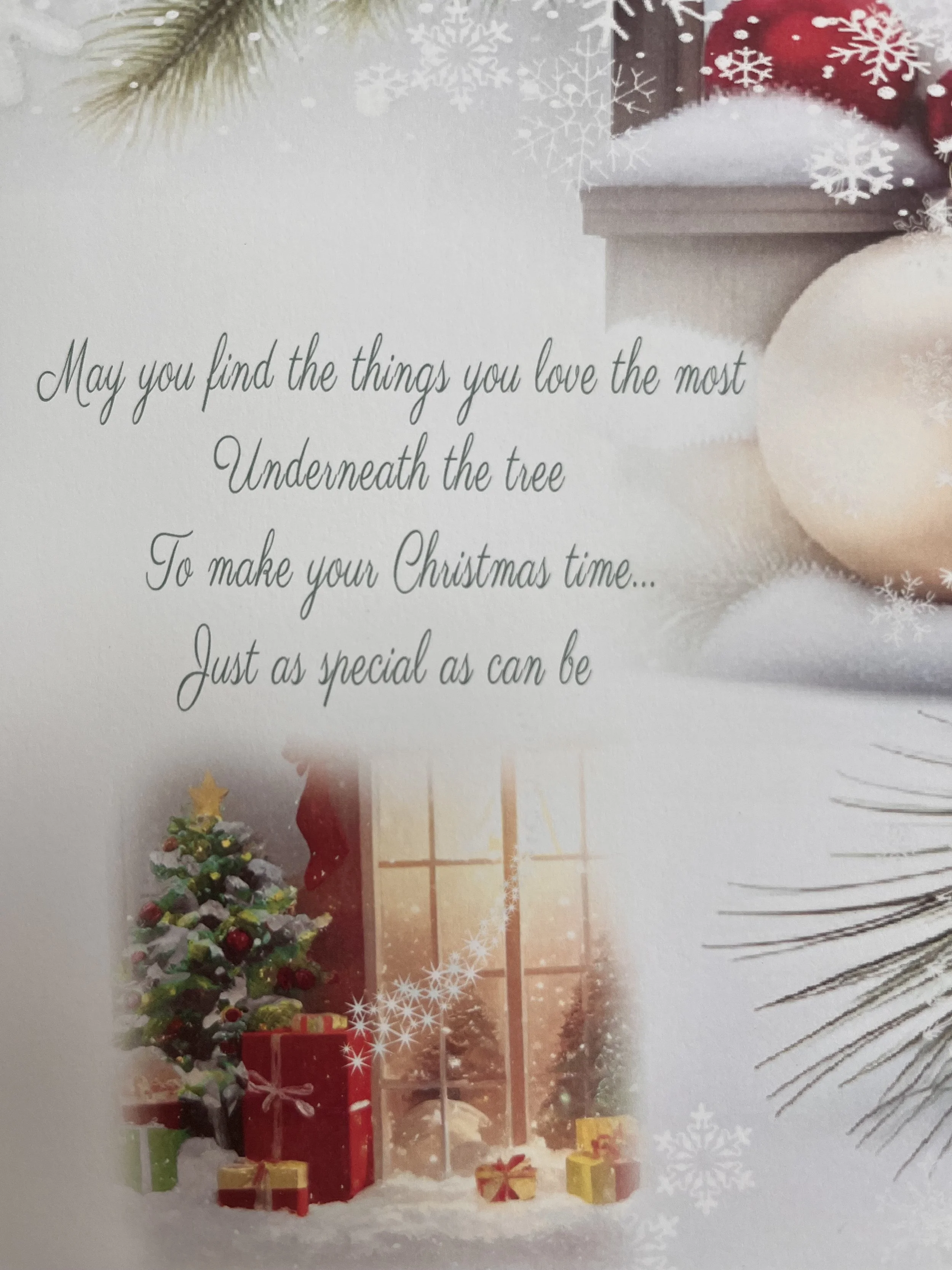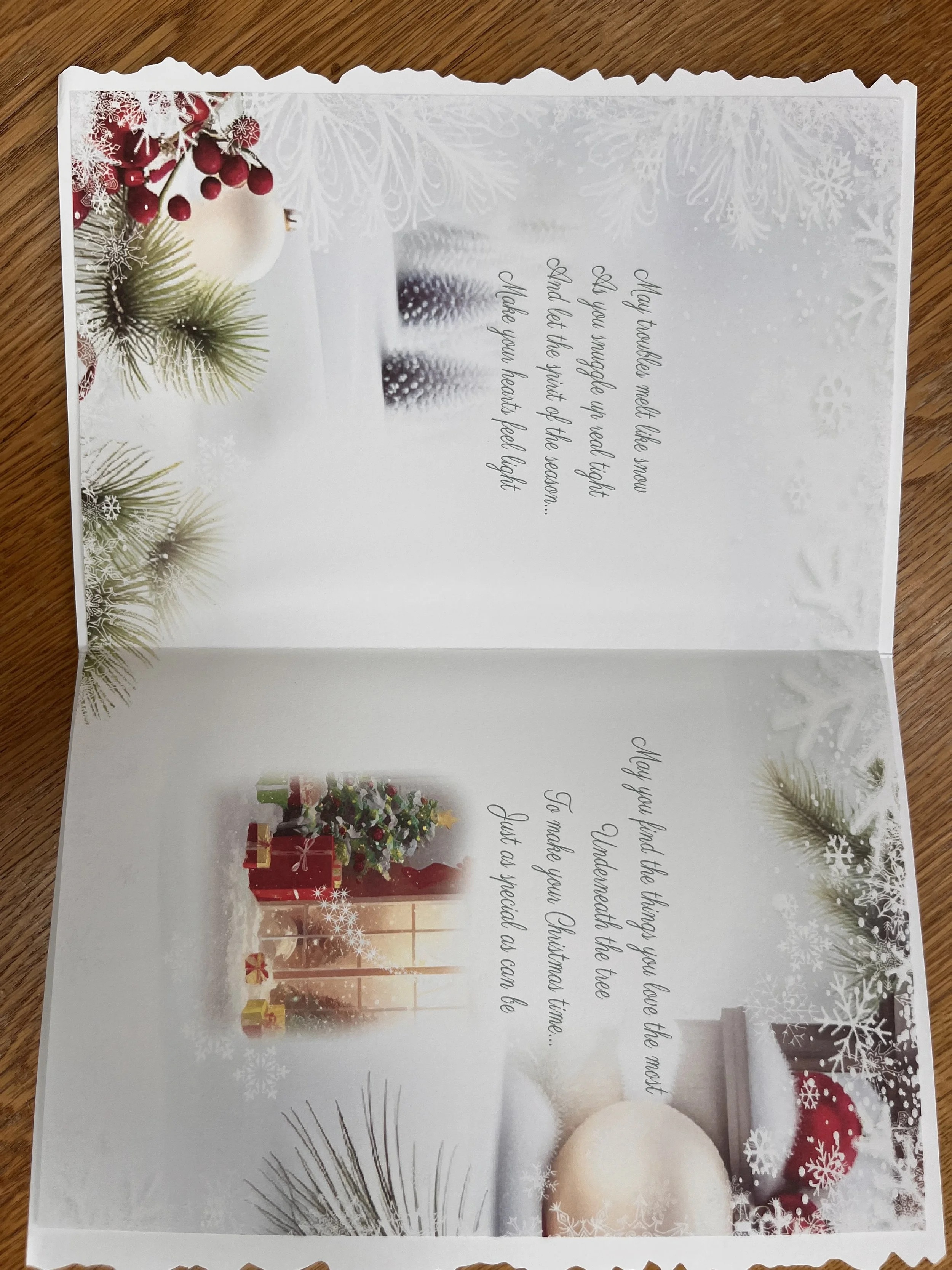 design has delicate, effective flitter and inside a pretty festive colour illustrated insert