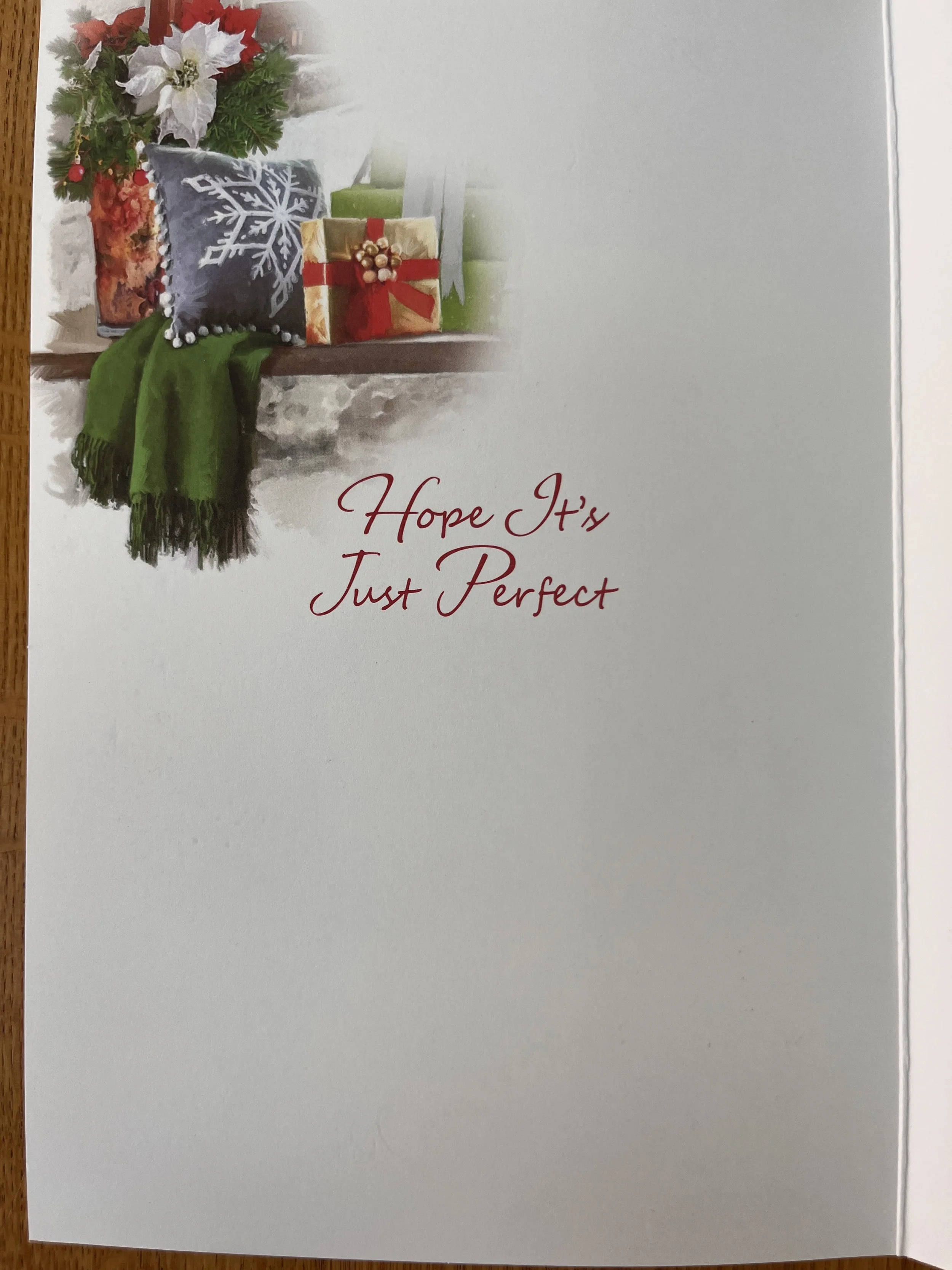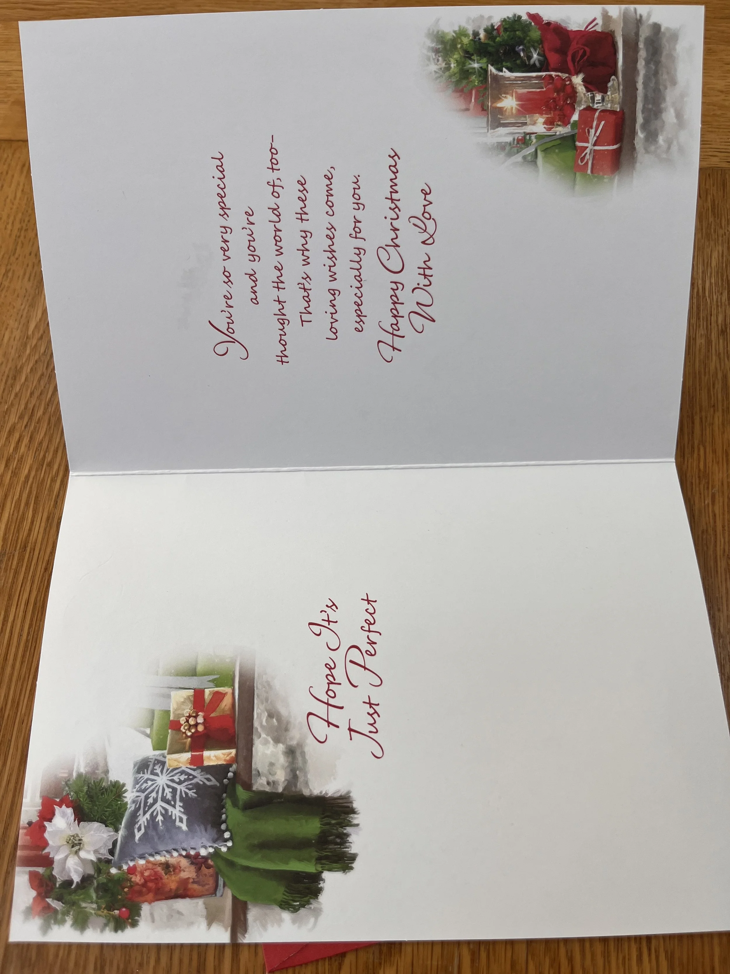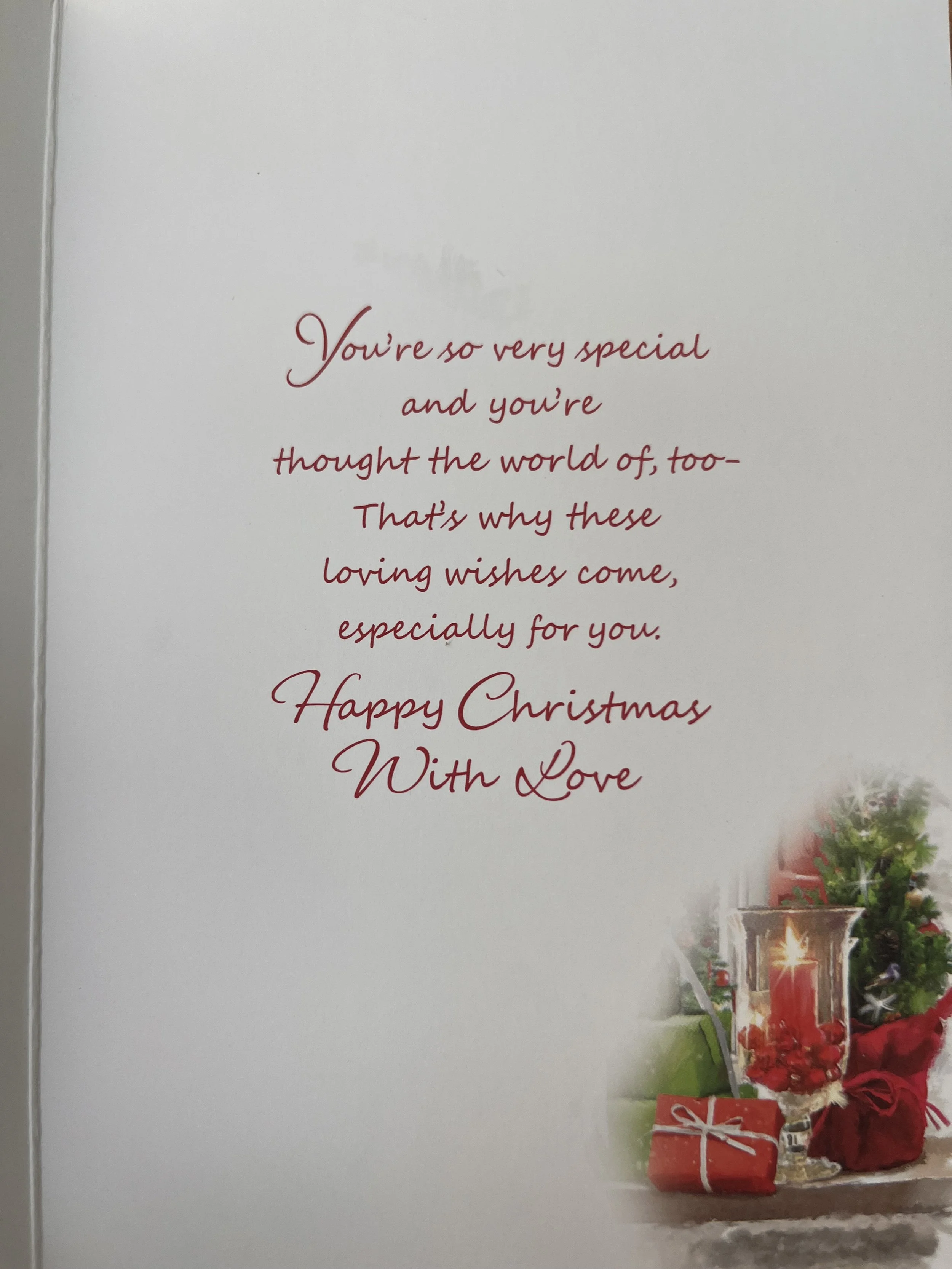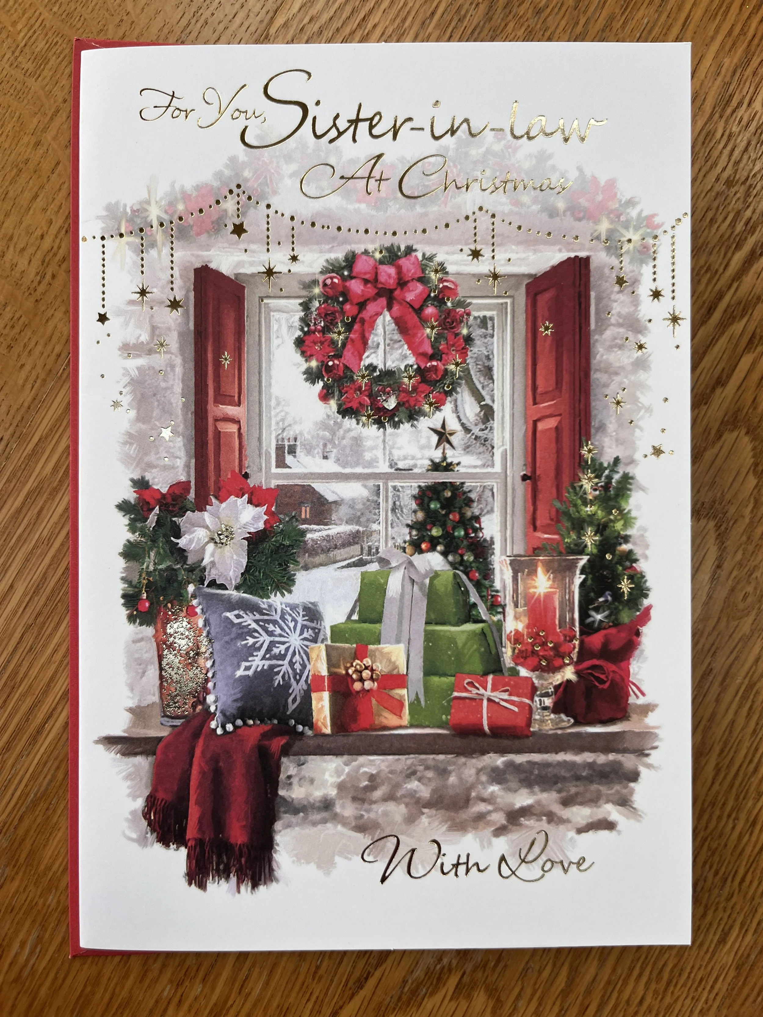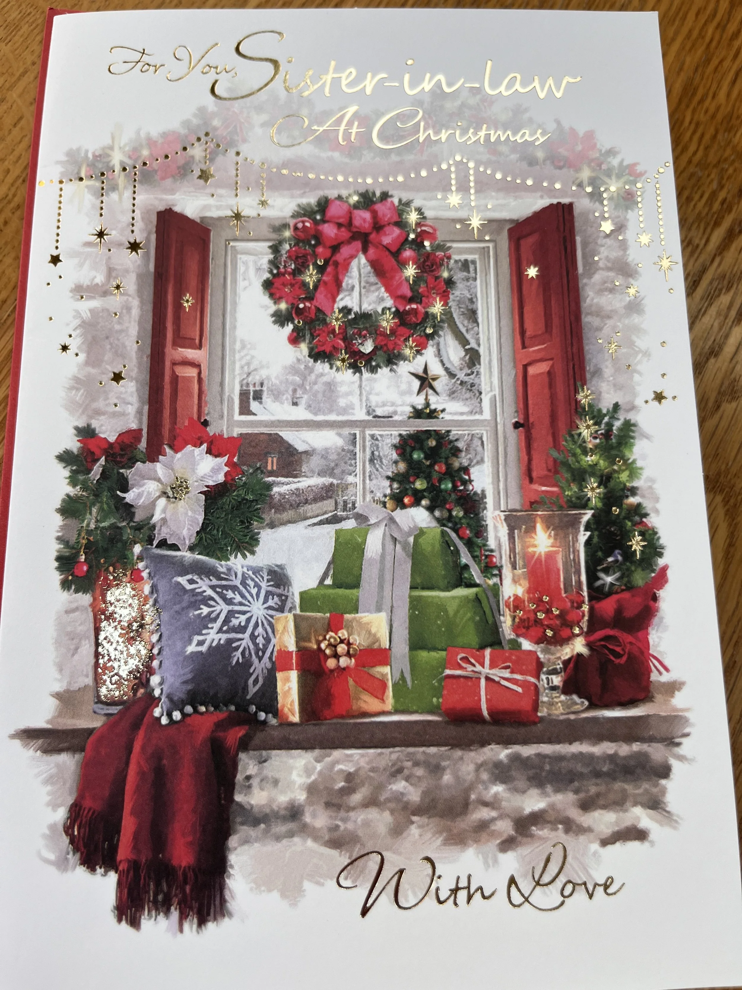 Sister in Law Christmas Card design has effective gold foil, embossing and inside full colour with illustrations