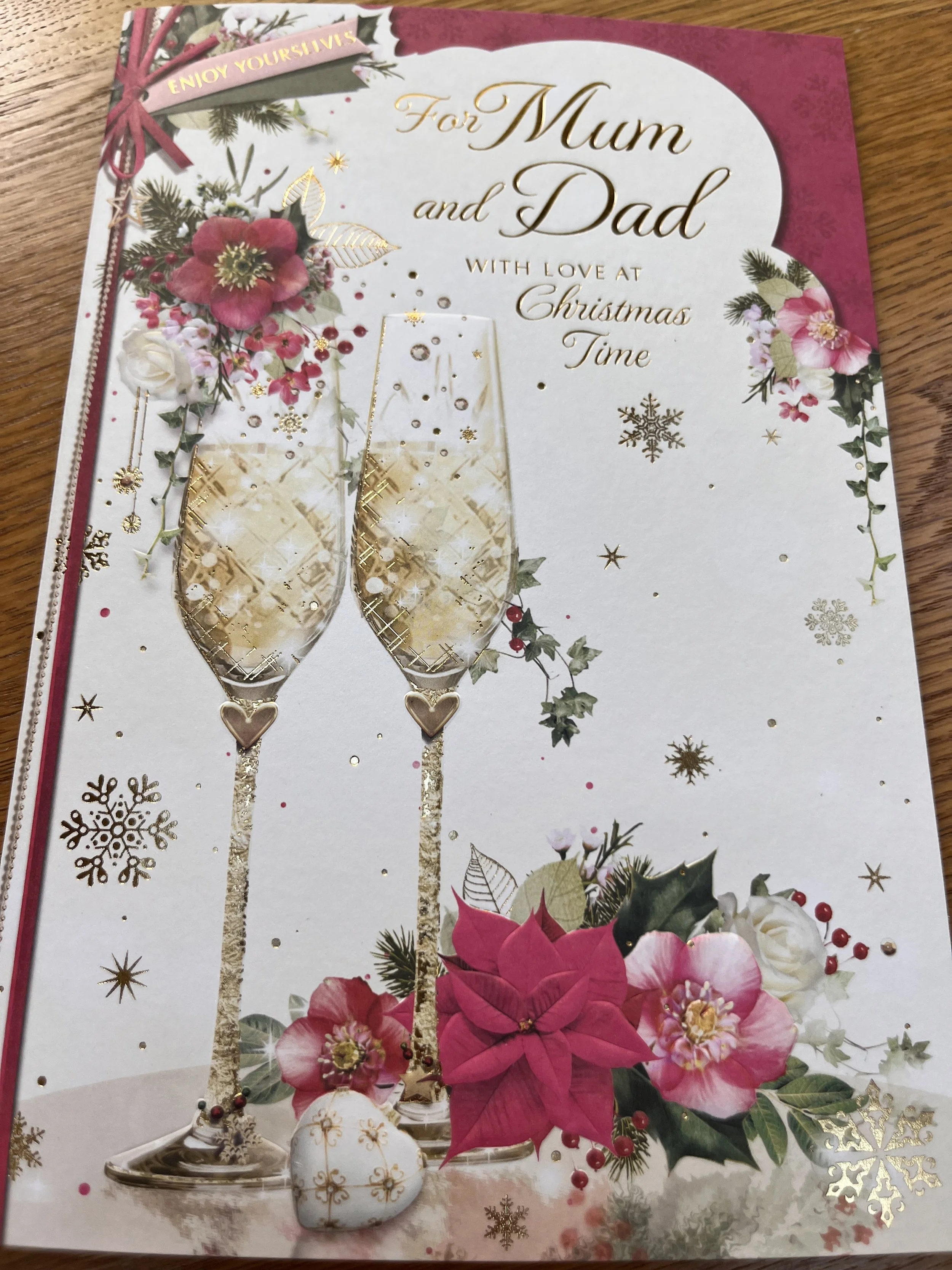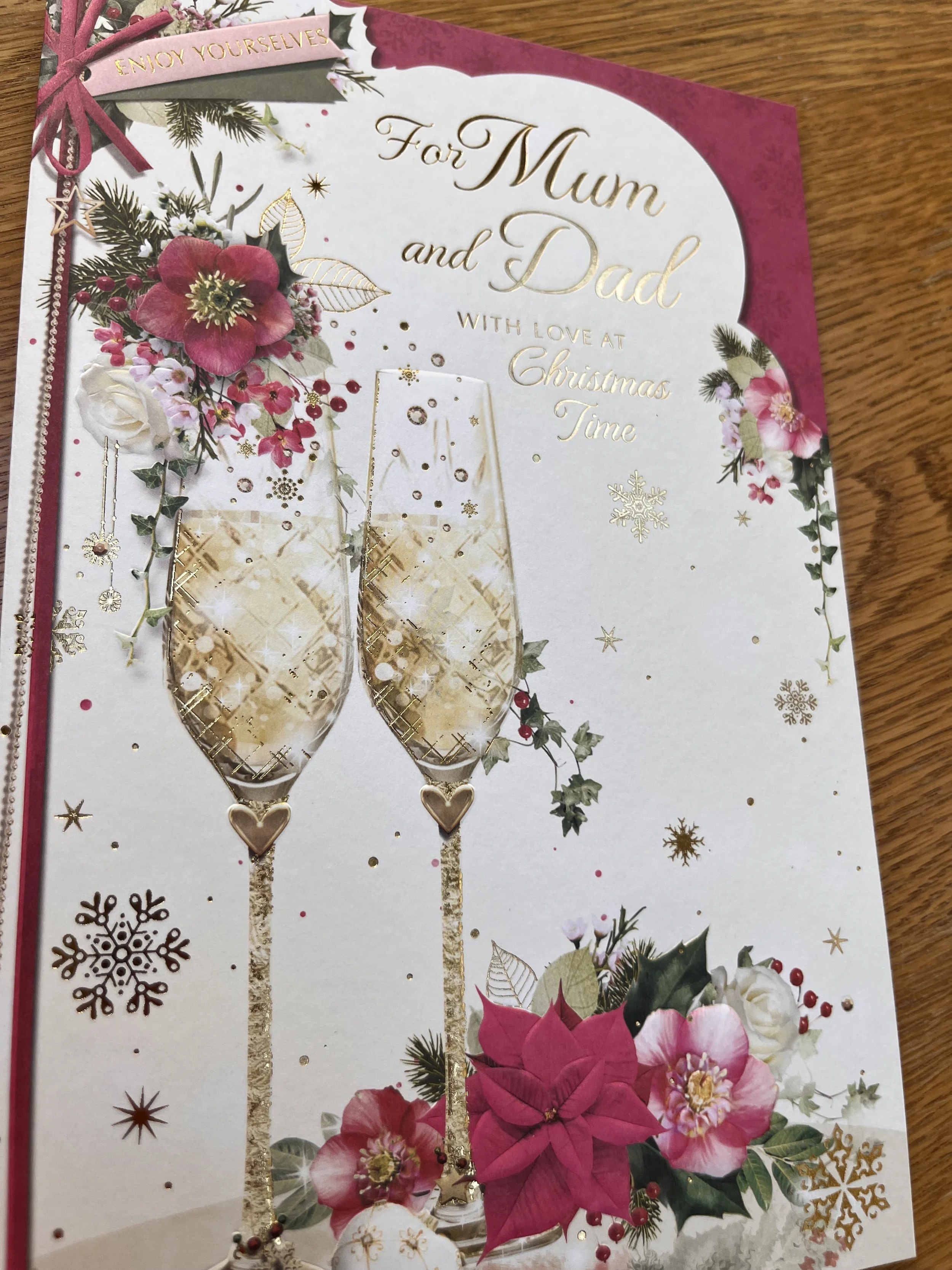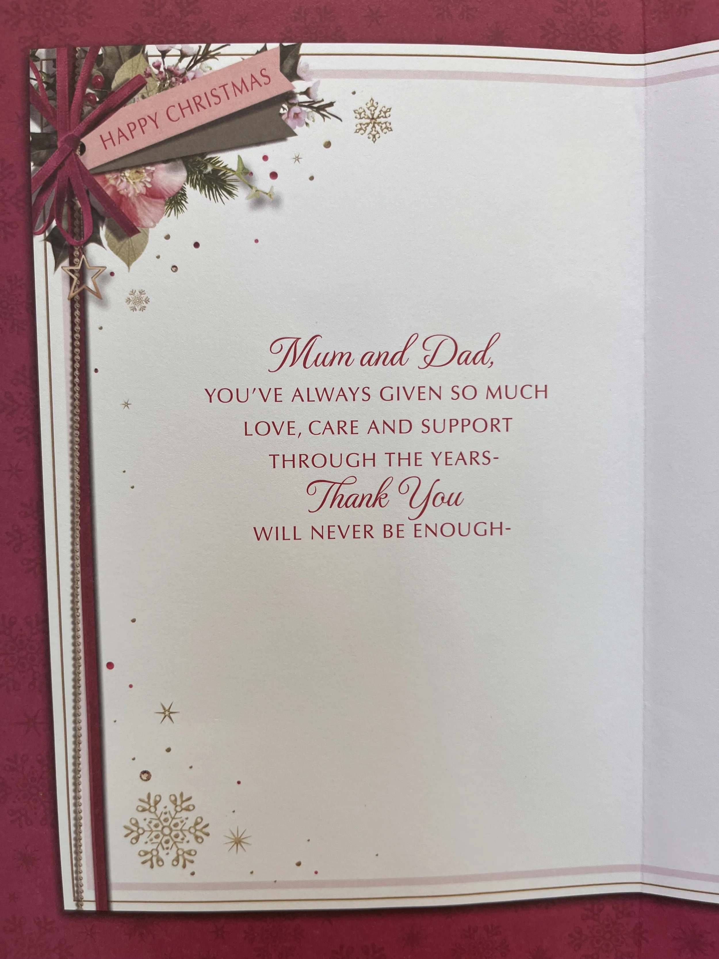 With Love Mum and Dad Christmas card Loving Words design has both a rotating heart and flip over heart feature, encapsulated flitter on unique photographic imagery with Loving Words that continue inside on a full colour illustrated top quality insert