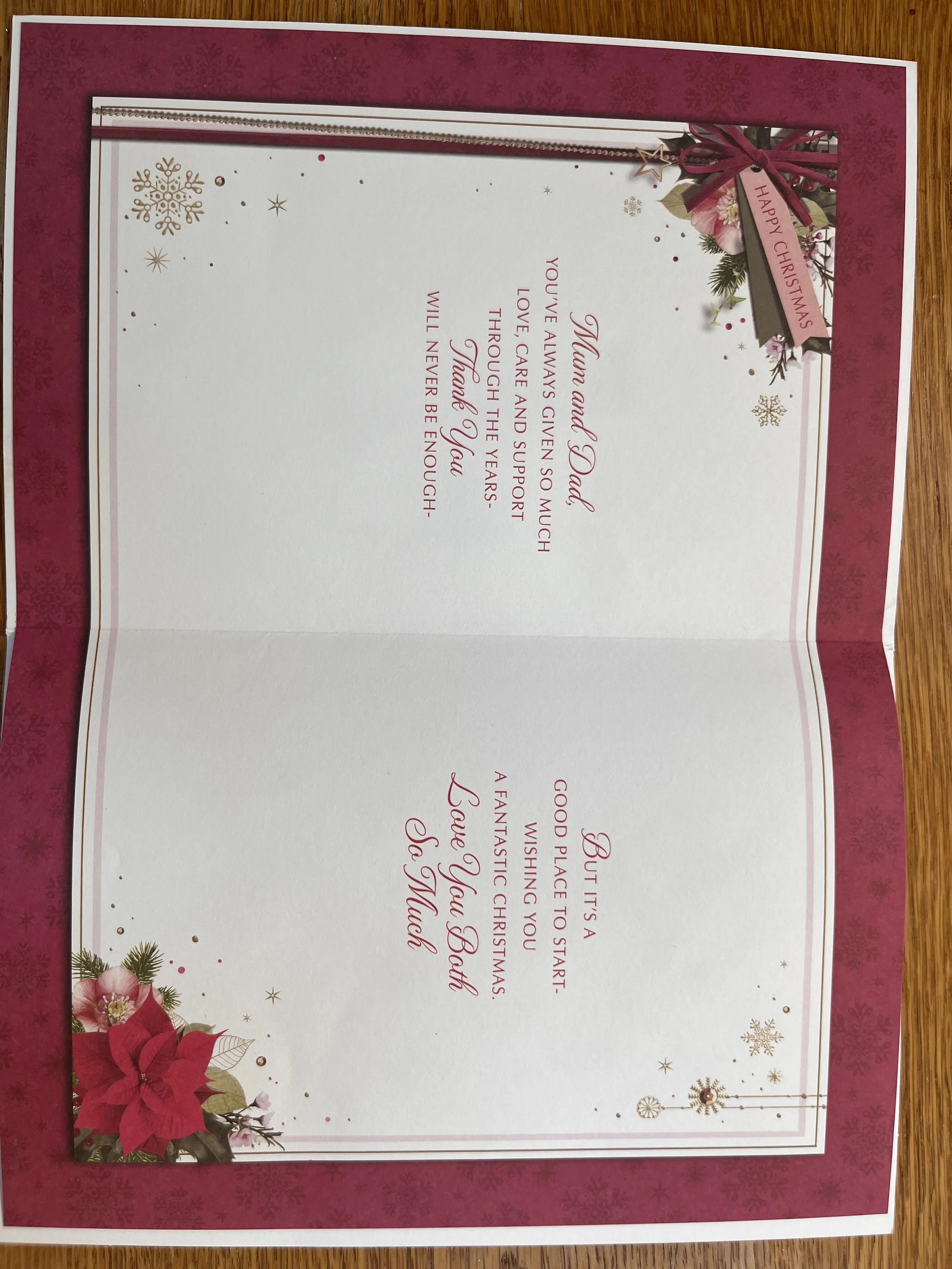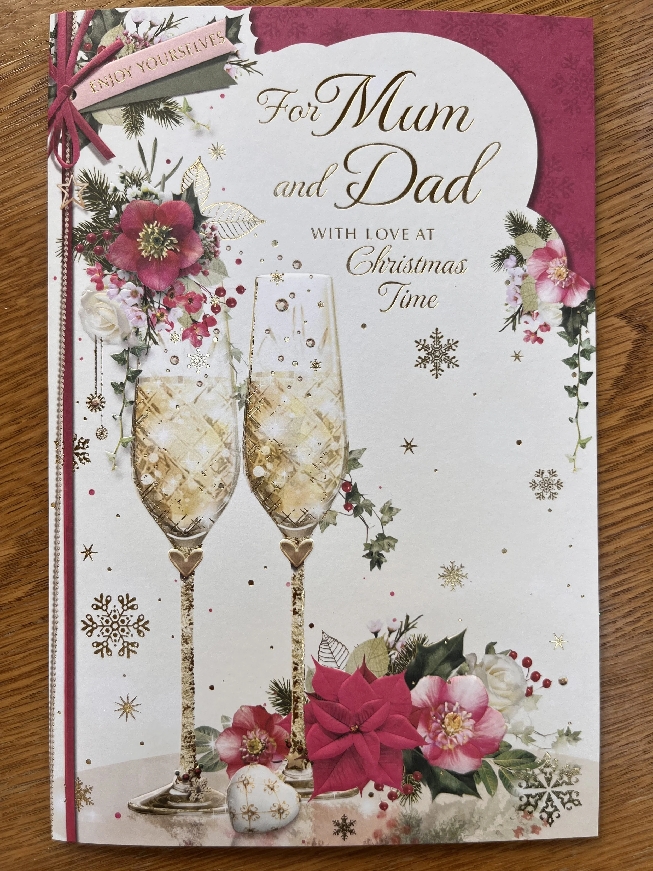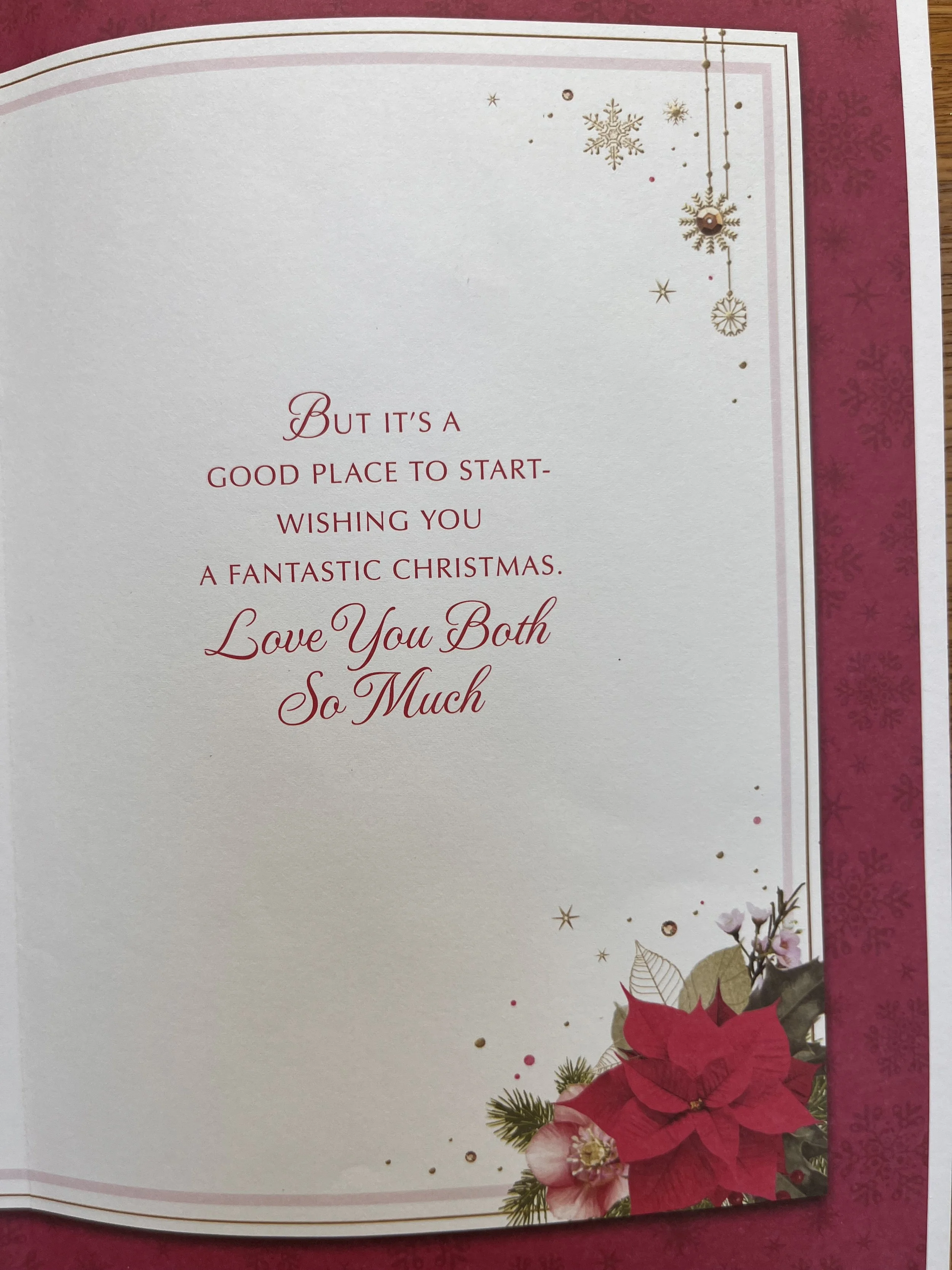 With Love Mum and Dad Christmas card Loving Words design has both a rotating heart and flip over heart feature, encapsulated flitter on unique photographic imagery with Loving Words that continue inside on a full colour illustrated top quality insert