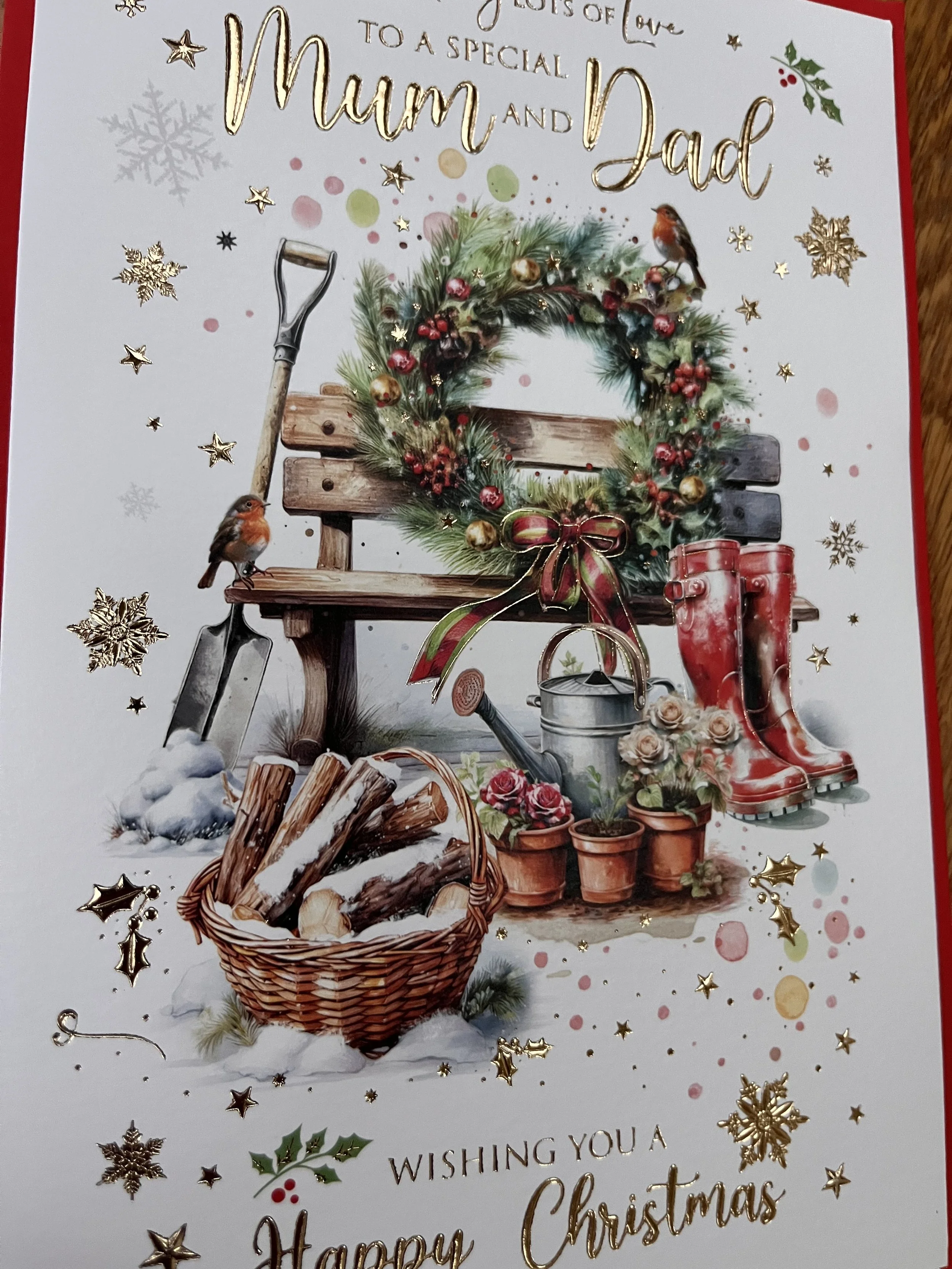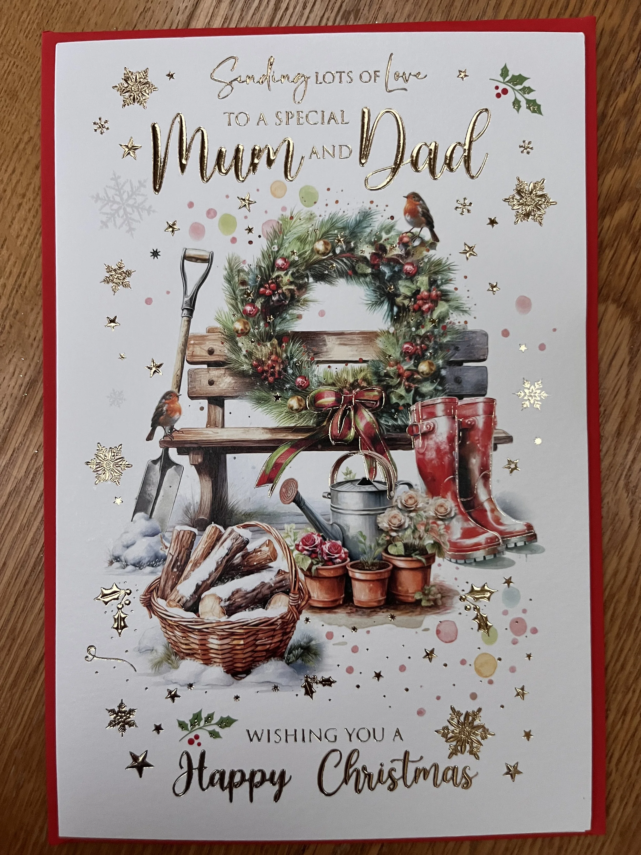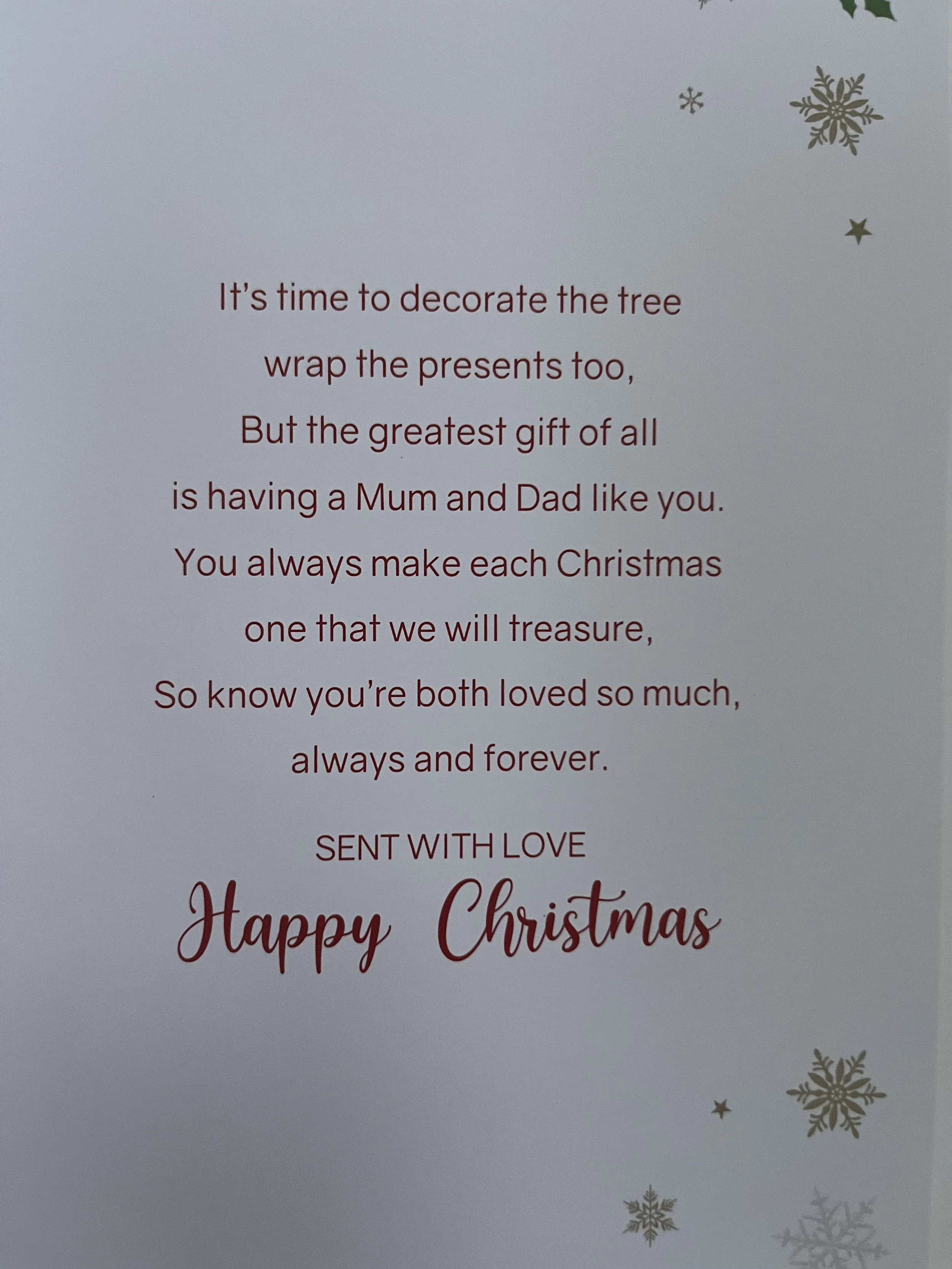 Mum and Dad Christmas Card “ Loving Words” design features scalloped edges, encapsulated flitter on unique photographic imagery with their signature Loving Words which continue inside on a full colour quality insert