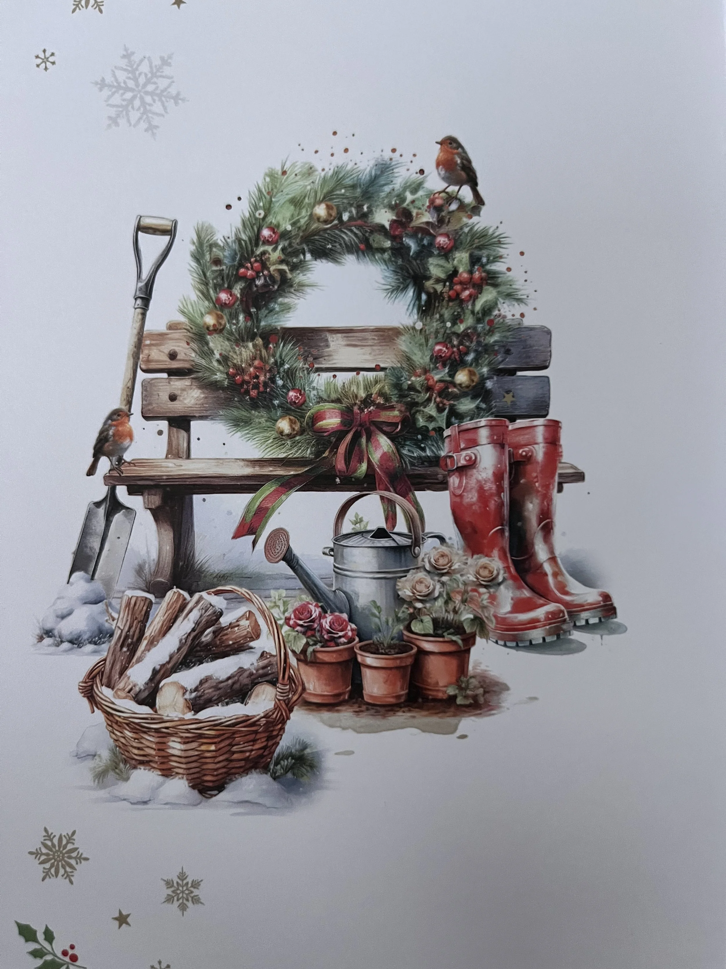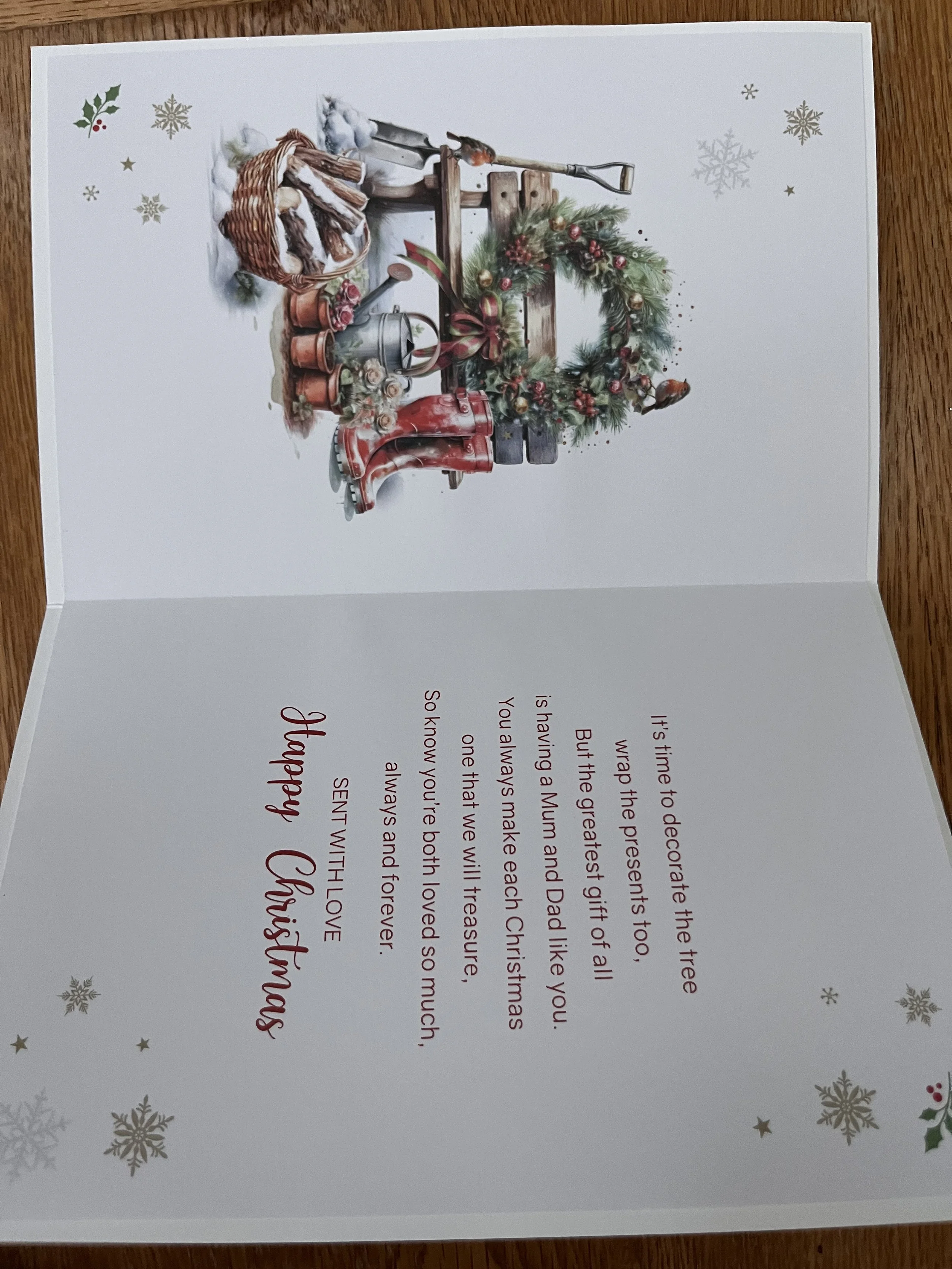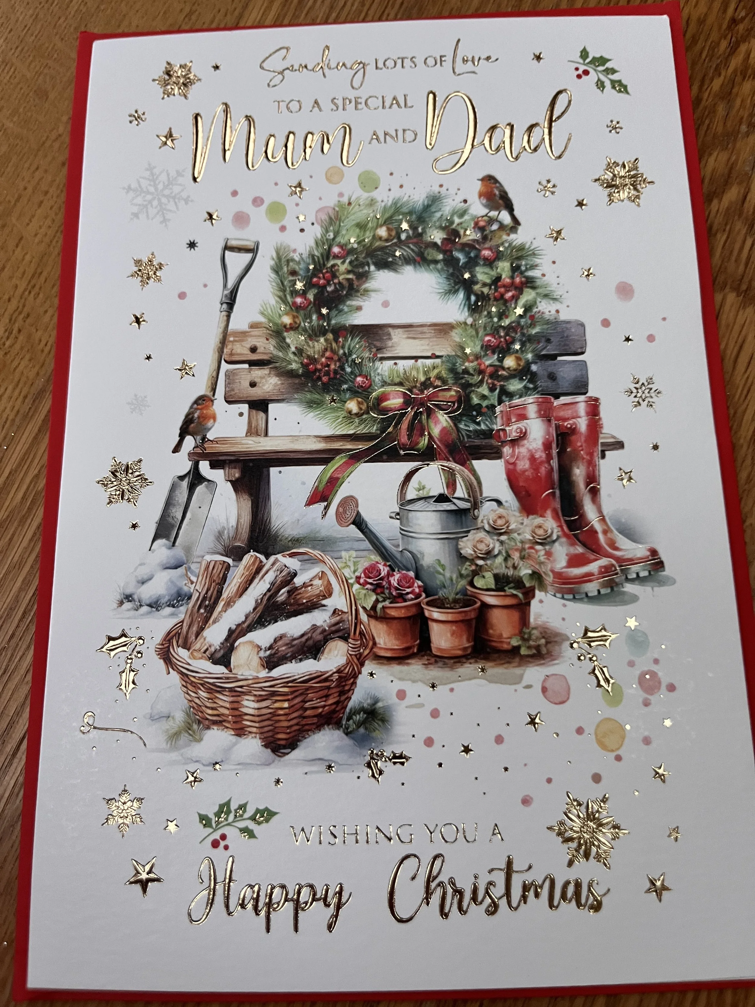 Mum and Dad Christmas Card “ Loving Words” design features scalloped edges, encapsulated flitter on unique photographic imagery with their signature Loving Words which continue inside on a full colour quality insert