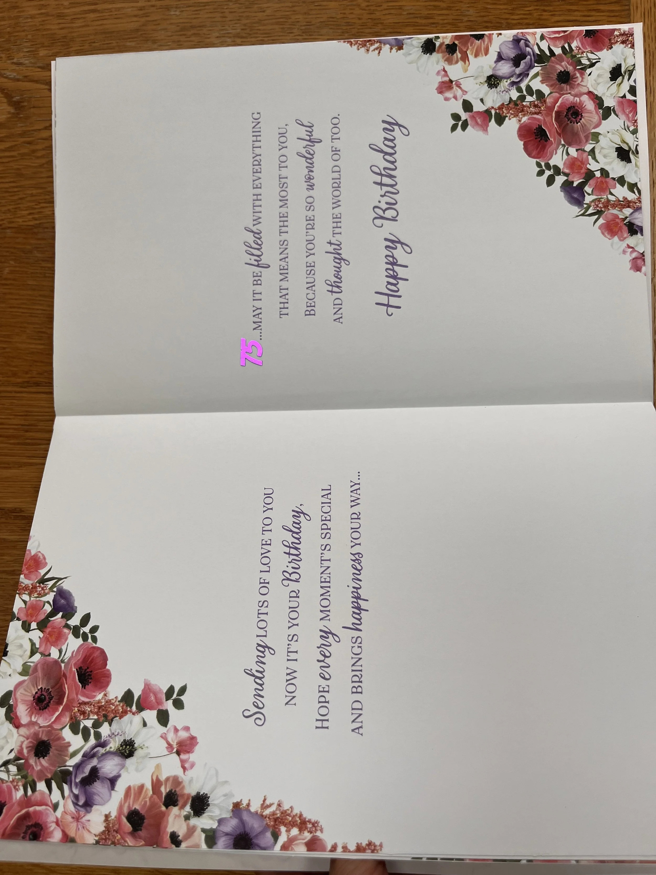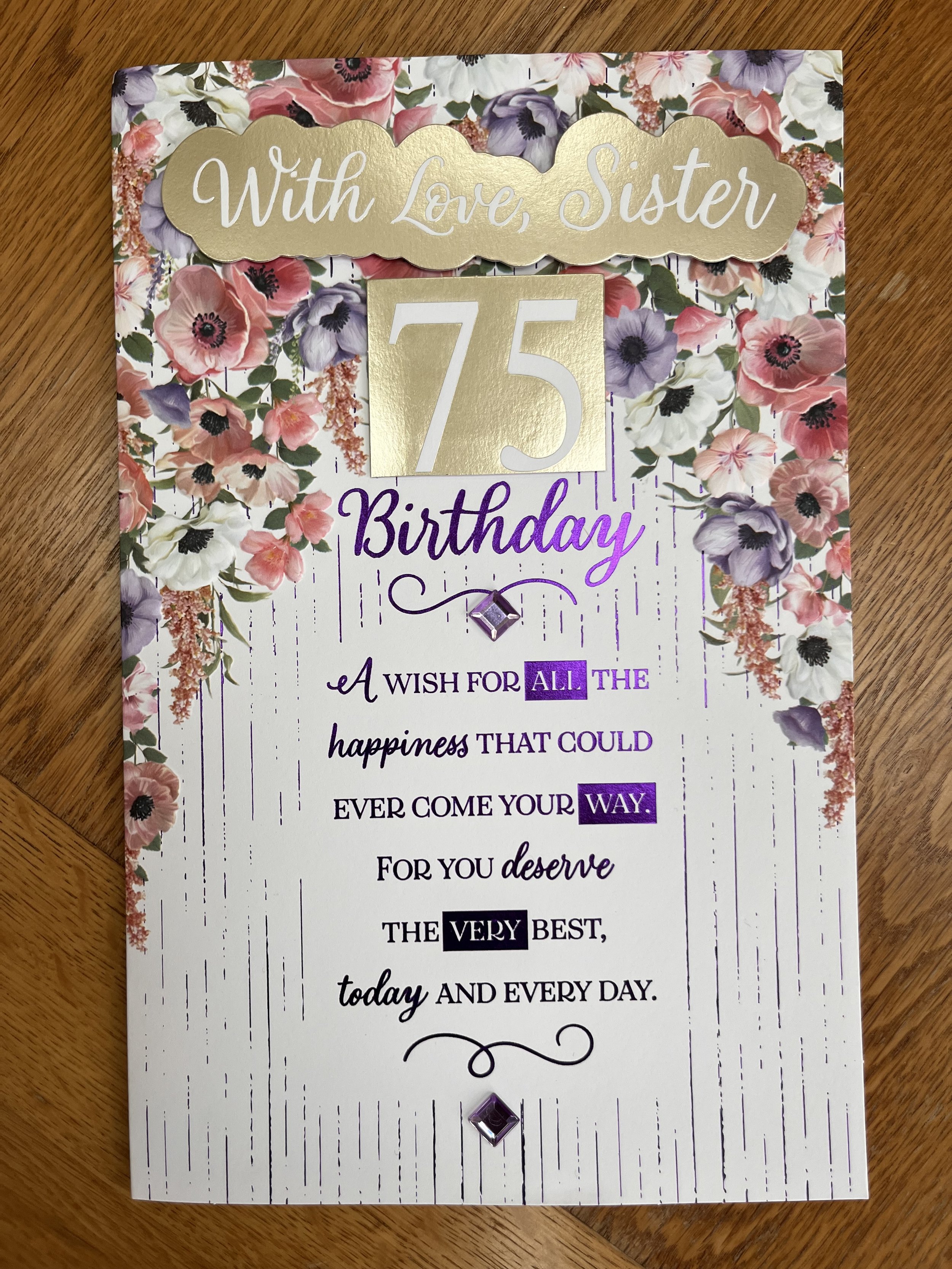 Sister 75th Birthday Card is an extra special, unique HAND FINISHED book type of design that features 3D attachments, foil, effective flitter, a 3d foiled embellishment and Inside are 7 pages of Loving Words on top quality full colour illustrated inserts with an attachment on the last page